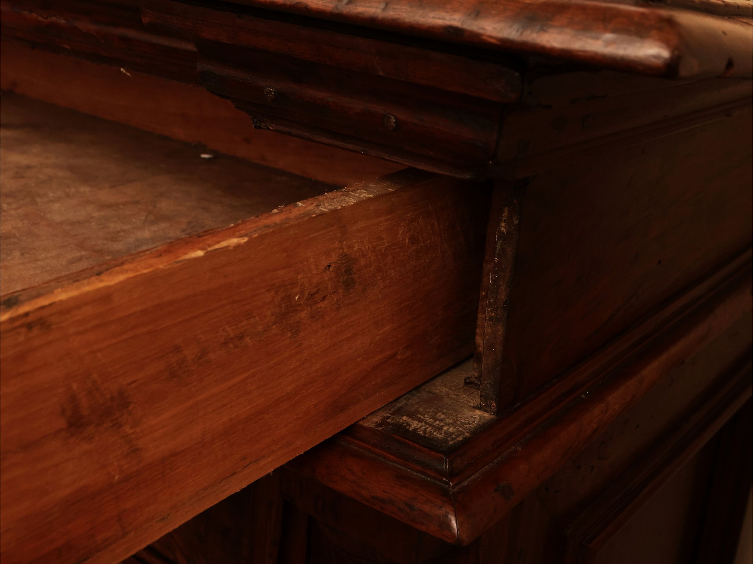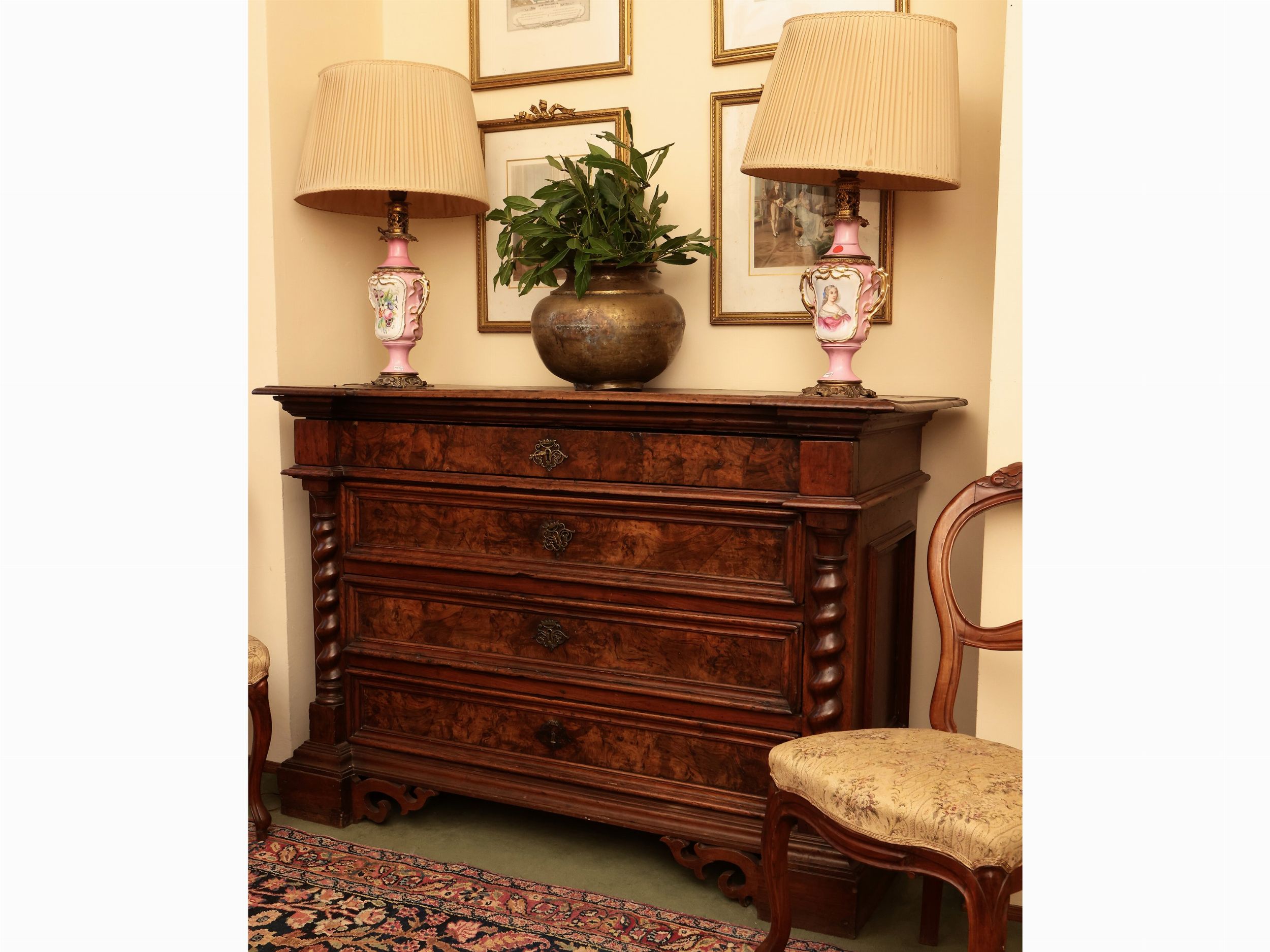 h cm 98x165x64 XVII secolo piano con bordo a becco di civetta, un cassetto nella fascia ed altri tre sottostanti con cornici modanate tra lesene tortili, dettagli in bronzo, fianchi a formelle e piedi a mensola intagliati a volute, alcuni difetti