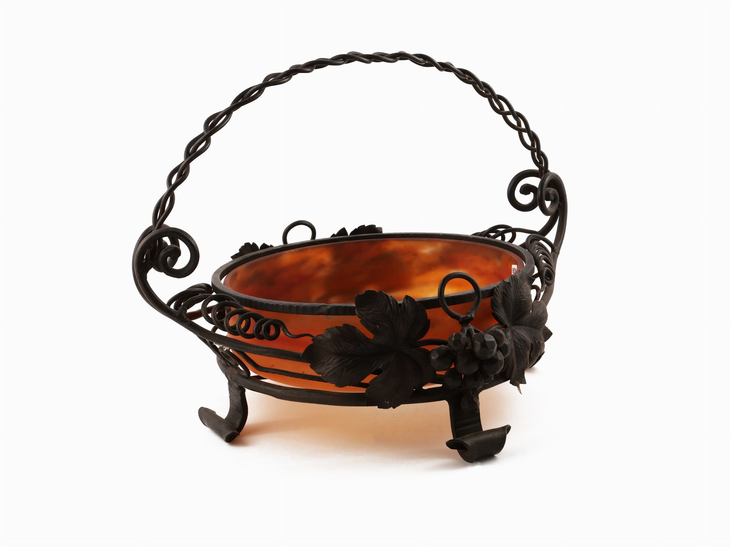 Francia, 1930 circa in vetro nuvolato sui toni dell'arancio entro intelaiatura in ferro battuto a forma di cesto. Firma sul corpo Muller Frères Luneville.