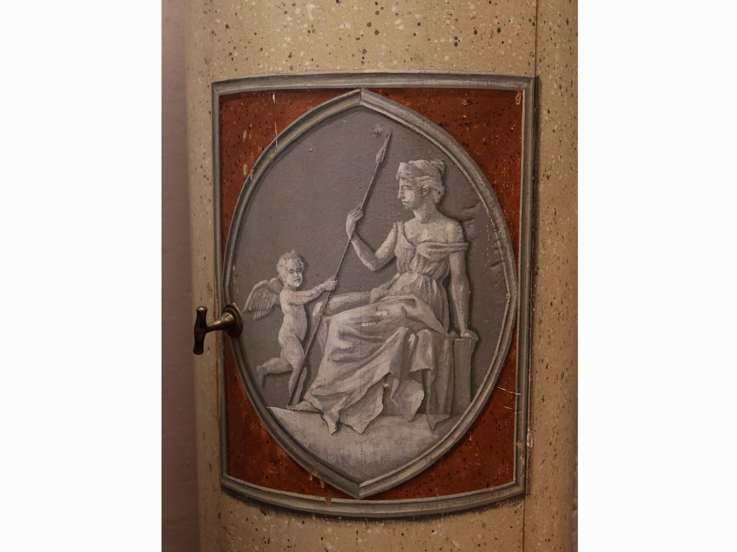 inizio del XIX secolo dipinto ad imitazione del porfido, un tiretto sotto il piano ed uno sportello dipinto con figura neoclassica sul fronte, su base ottagonale, lievi difetti