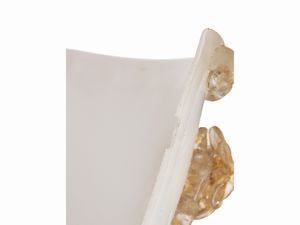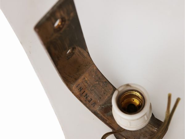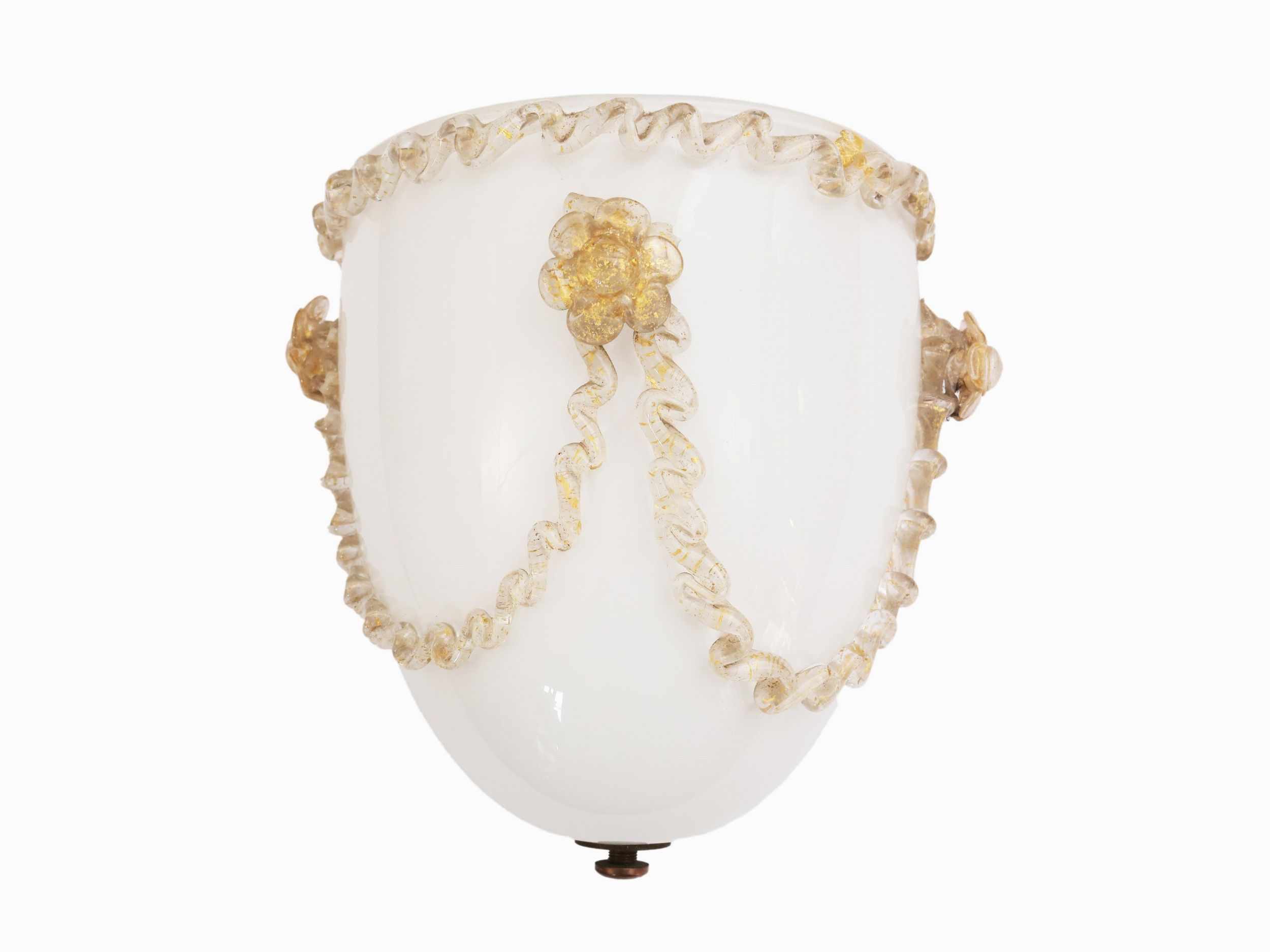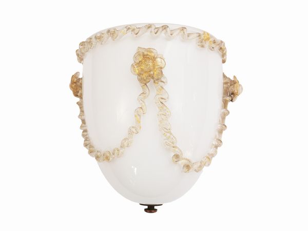 plafoniere h cm 16, diam cm 30, applique h cm 23x26x16 (4) XX secolo tre applique ed una plafoniera realizzati in vetro bianco, decorazione a serpentina applicata a caldo in vetro trasparente con inclusioni dorate sul brodo e a ricreare festoni e applicazioni a foggia di fiore