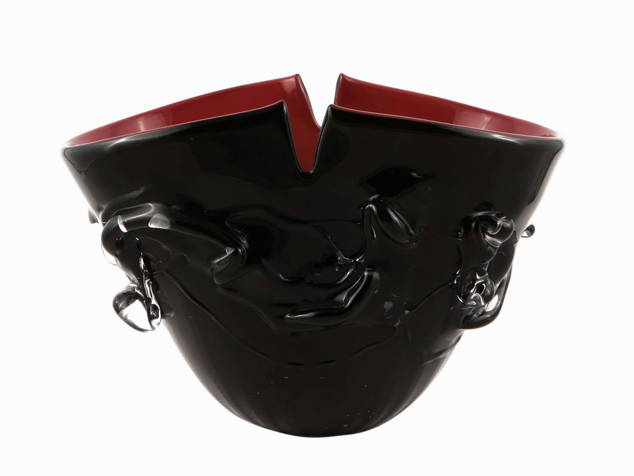 Murano, Italia 1980 circa in vetro rosso e nero, elementi decorativi in vetro trasparente in superficie.