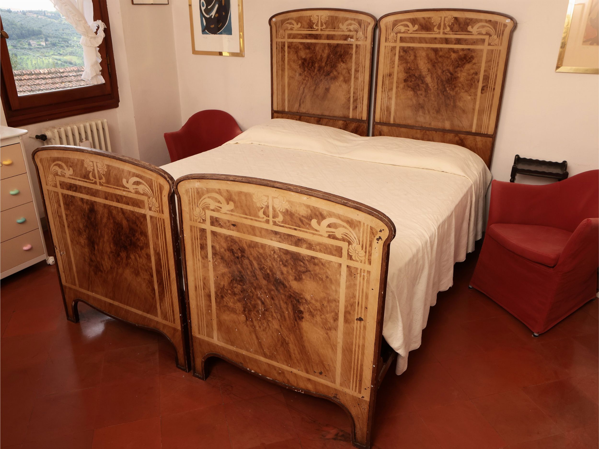 inizio del XX secolo testiere e pediere decorate ad imitazione di un intarsio in radica, profili in legno, completi di traverse, alcuni difetti