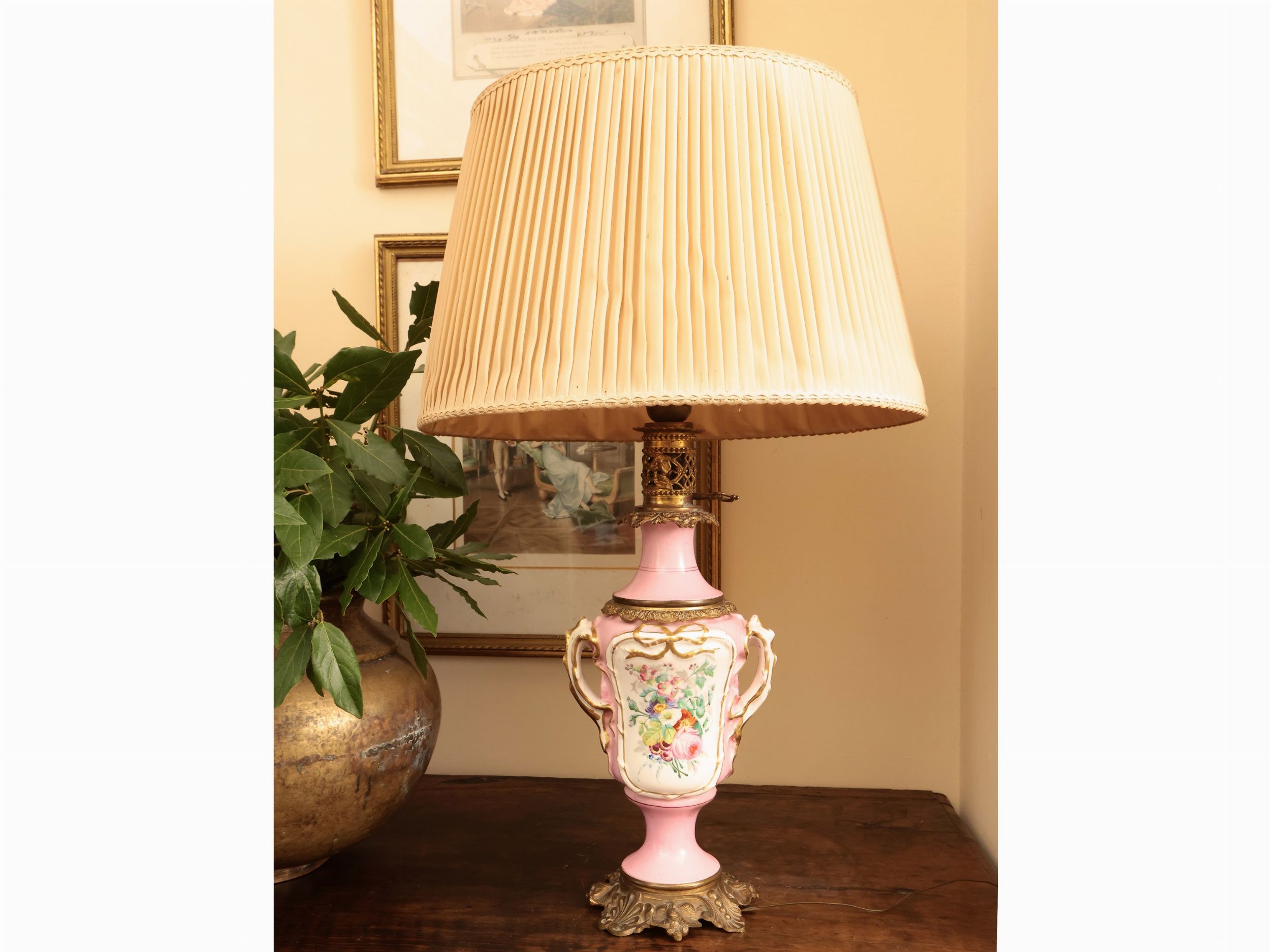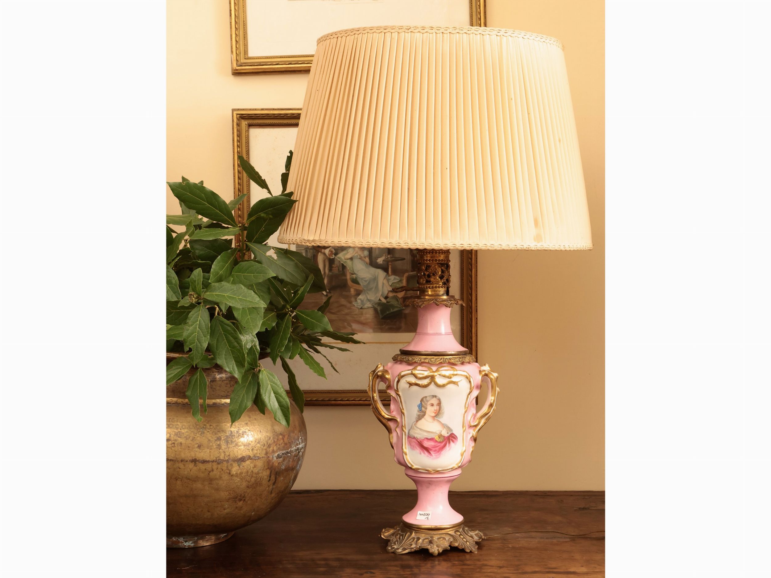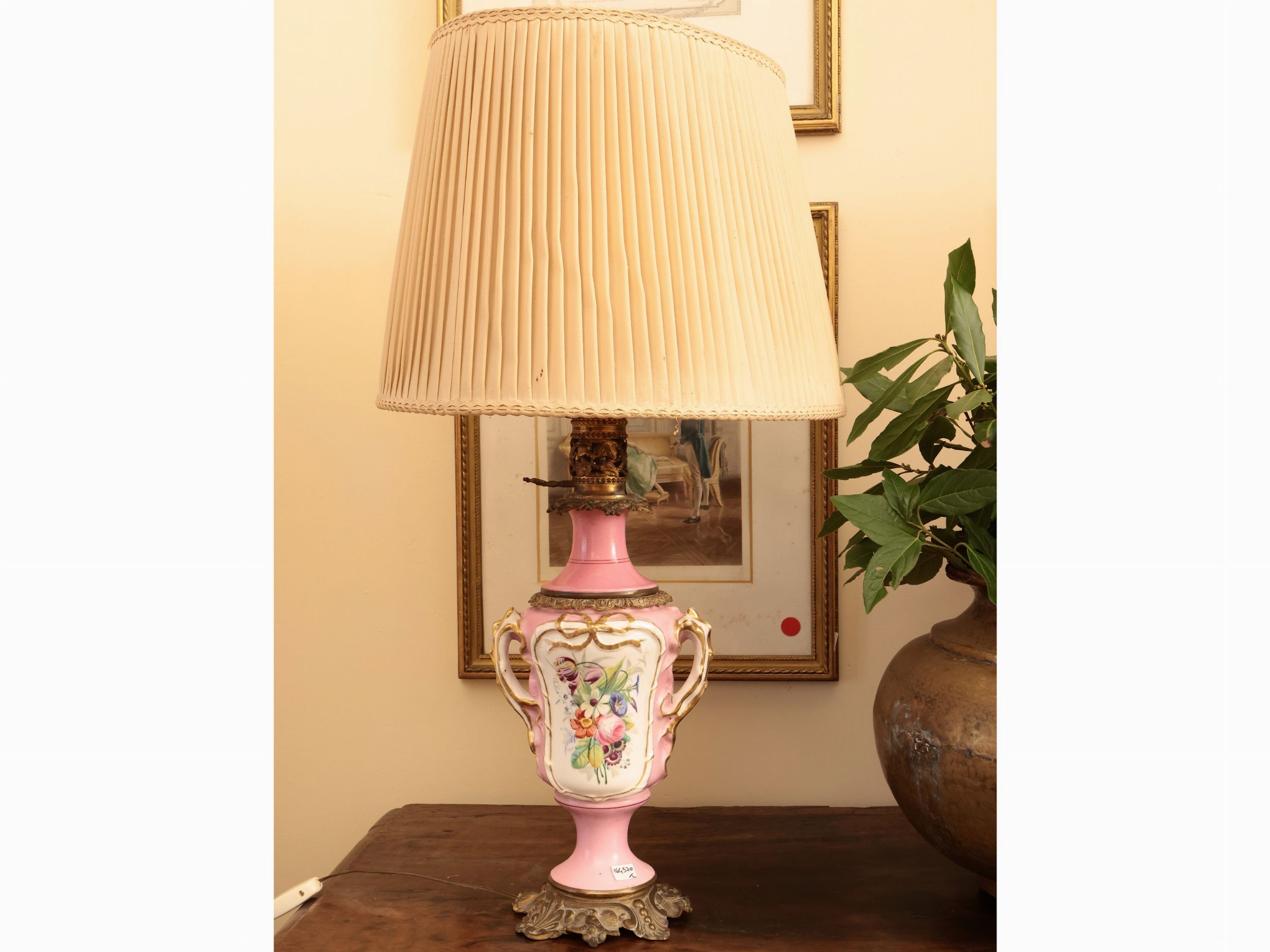 h cm 50 Francia, seconda metà del XIX secolo realizzati come vasi biansati, dipinti con ritratti e trionfi di fiori entro riserve sagomate e lumeggiate in oro su fondo rosa, dettagli e base circolare in bronzo dorato sbalzato con volute vegetali, corredate da paralume in tessuto avorio (difetti)