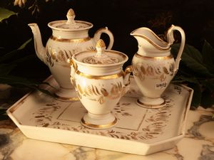 h da cm 13 a cm 16, vassoio cm 27x27 (4) Francia, inizio del XIX secolo composto da teiera, lattiera, zuccheriera [..]