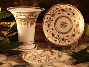 h cm 19 (3) prima metà XIX secolo con lumeggiature dorate, abbinato a due piatti dipinti con motivi floreali, [..]