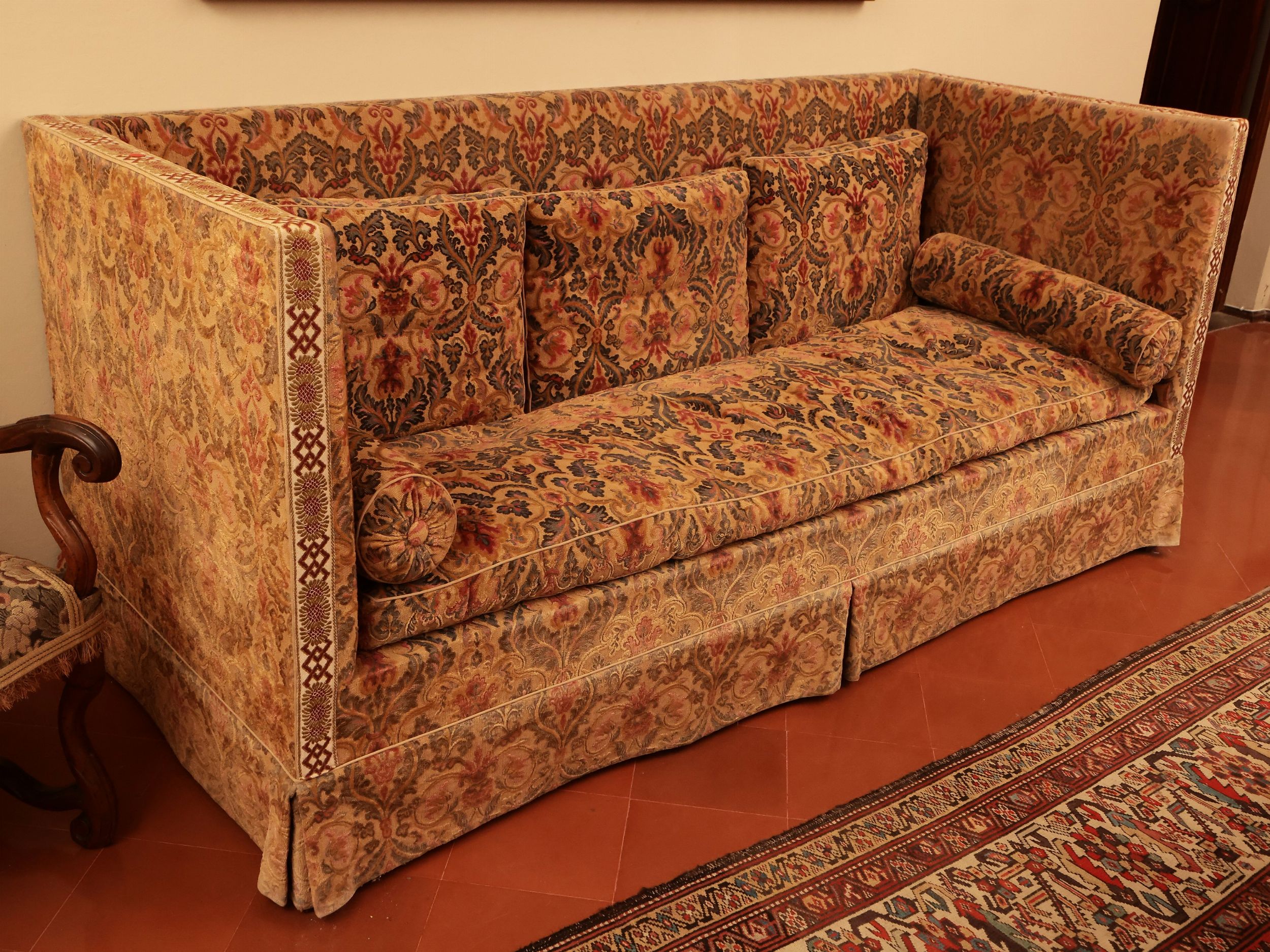inizio del XX secolo imbottito e rivestito in velluto damascato alto-basso nei toni pastello, alto schienale e braccioli, corredato da due cuscini a rullo, difetti