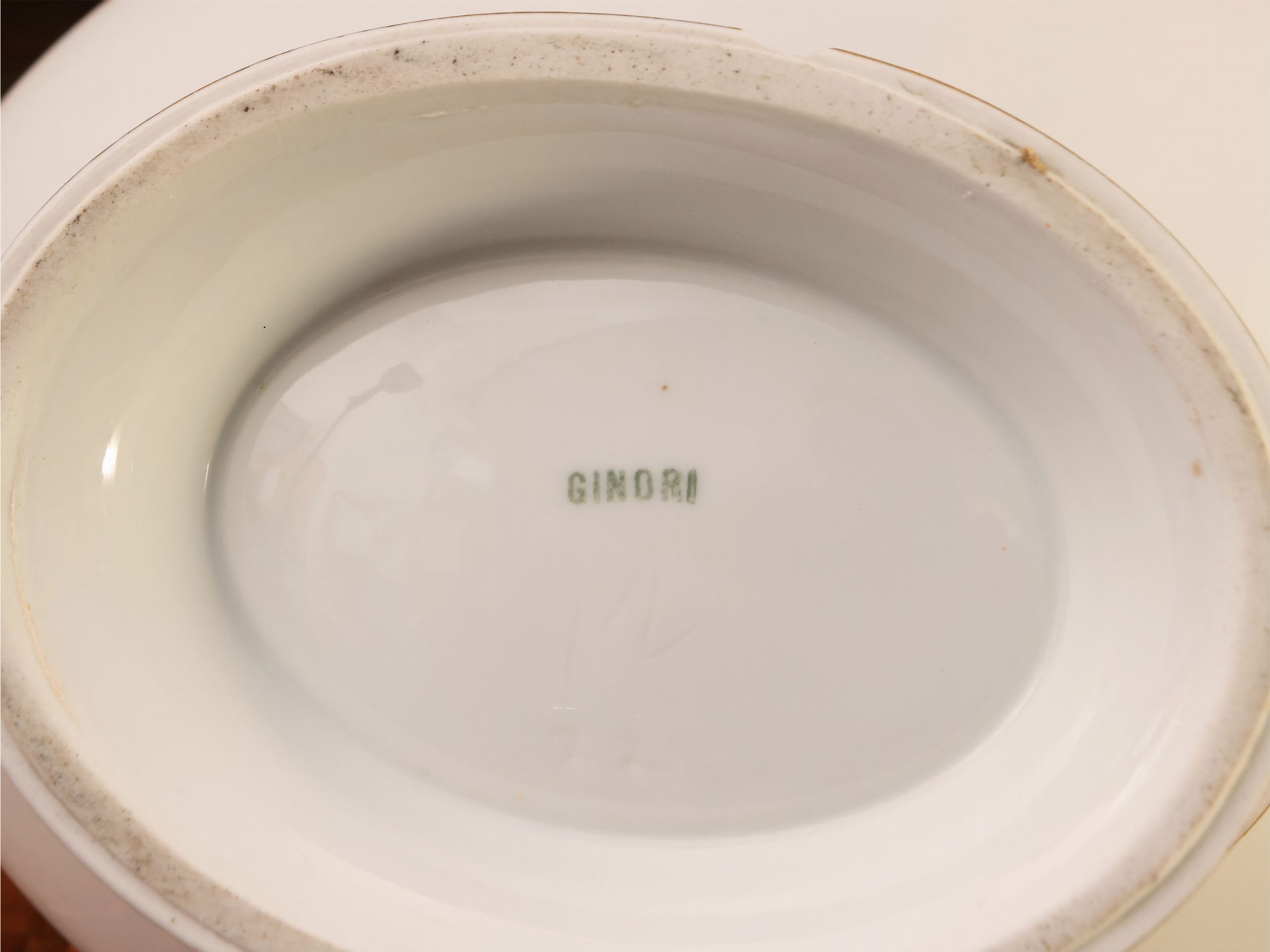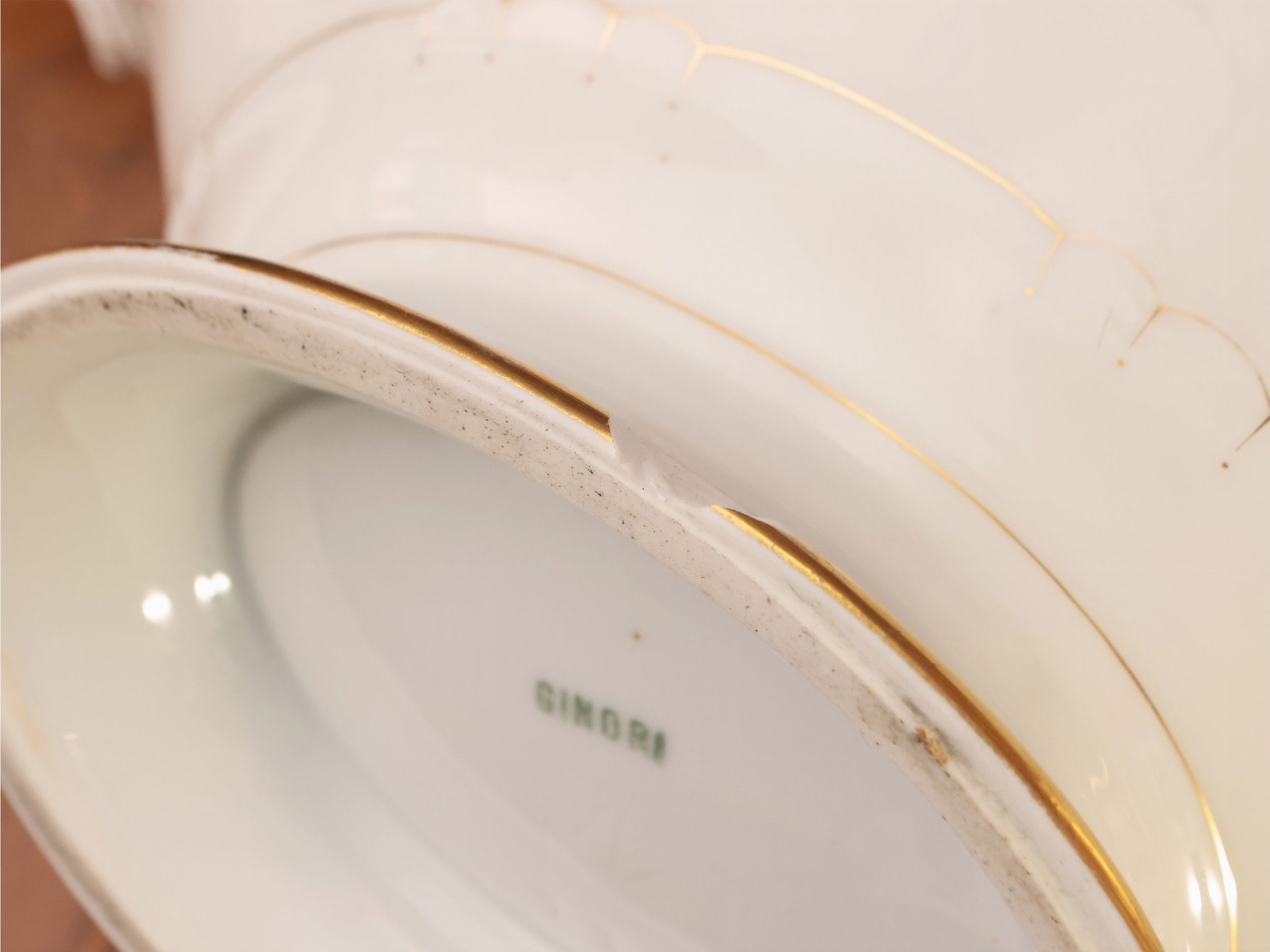 fine del XIX/inizio del XX secolo bordo mosso, lumeggiato in oro con volute, prese laterali decorate con teste di ariete, quella centrale modellata come pera, alcuni difetti