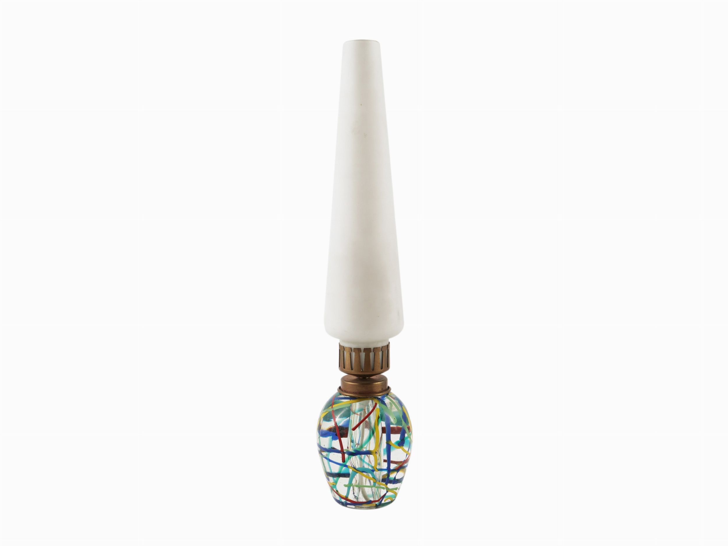 h cm 45, diam cm 8 Murano, Italia 1960 circa base in cristallo massiccio con canne colorate disposte casualmente, diffusore in vetro satinato, punto di congiunzione in ottone.