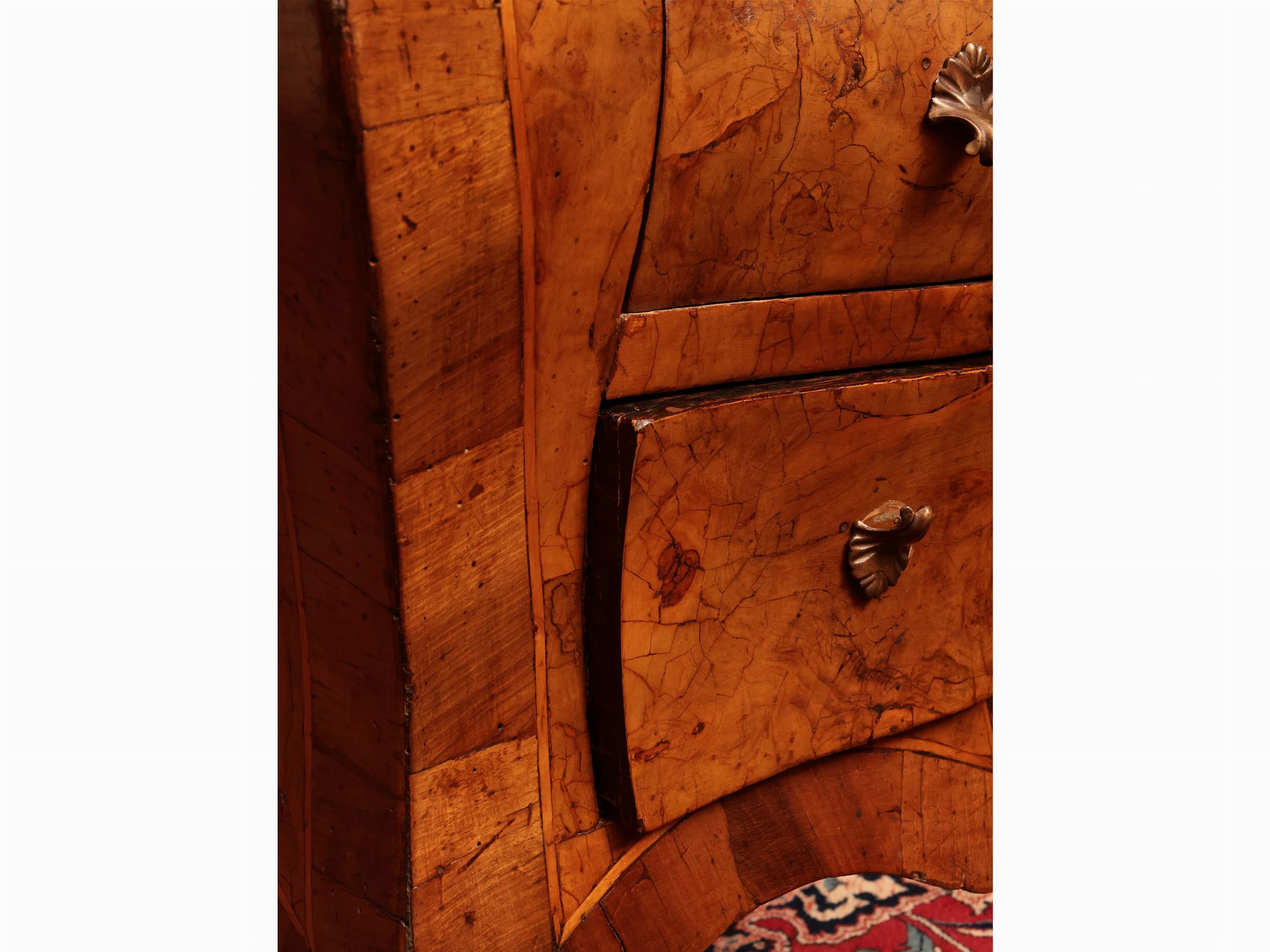 Veneto, XVIII secolo intarsiata con filettature a formare specchiature, interamente mossa, piedi a volute con finale a zoccolo