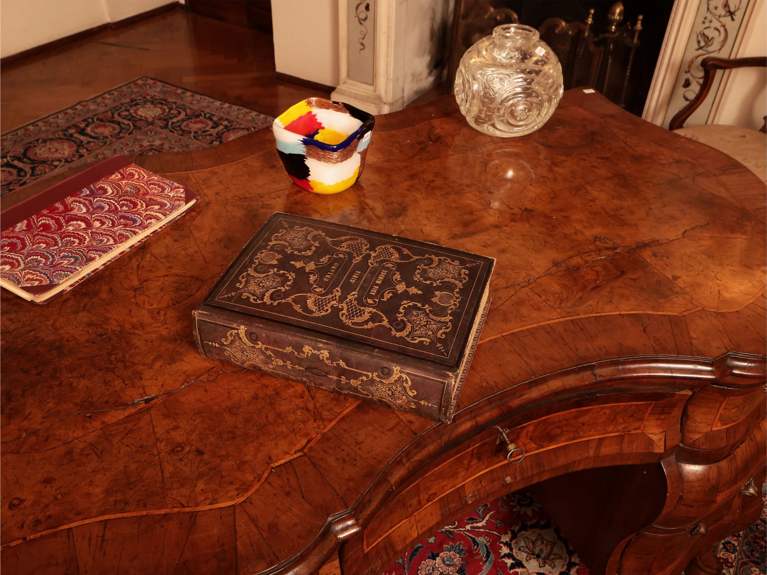 Scrivania da centro a banco, impiallacciata in noce e radica di noce