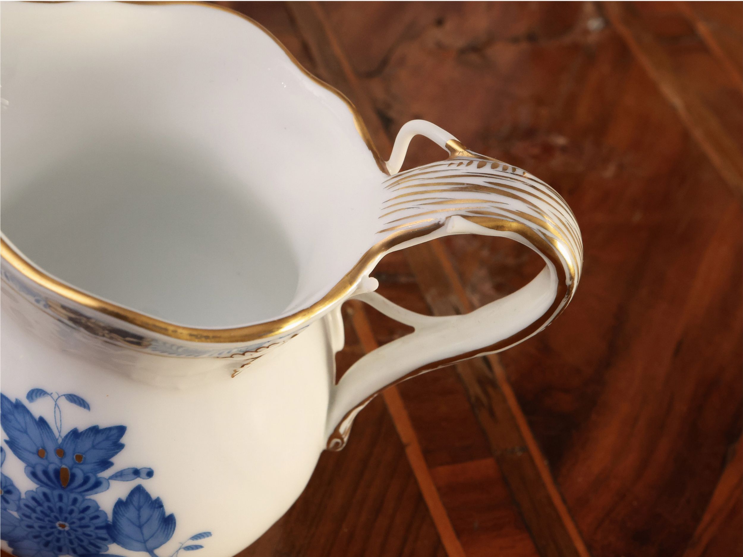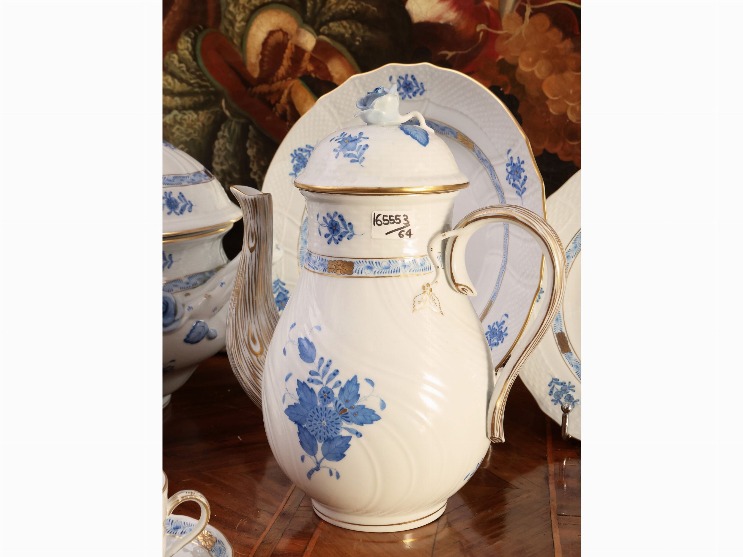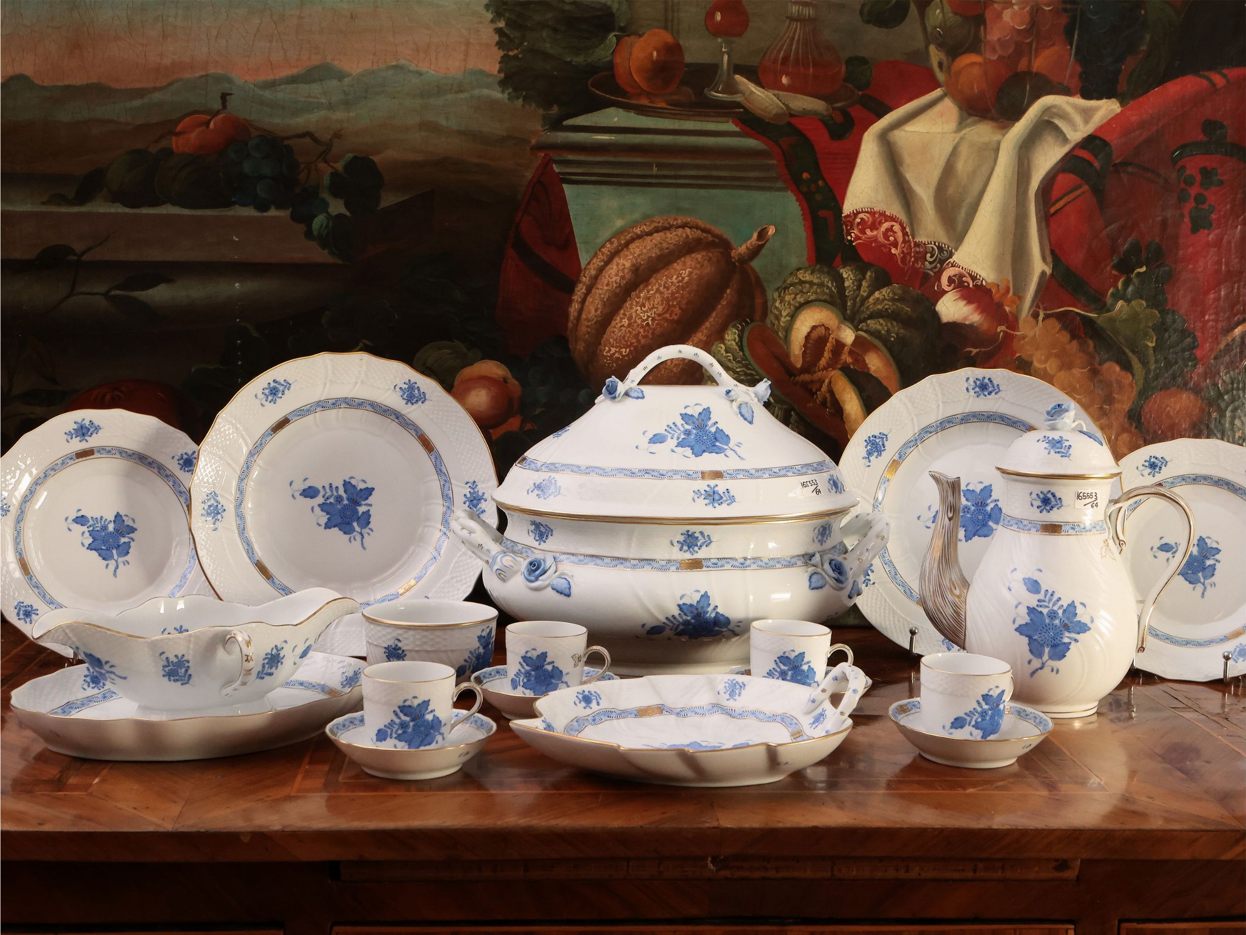 Ungheria, seconda metà del XX secolo dipinto in monocromia azzurra e lumeggiature dorate, composto da 18 piatti piani, 12 piatti fondi, 12 piattini da frutta, una zuppiera, una insalatiera di forma quadrata, 2 vassoi ovali a scalare ed uno rotondo, una antipastiera, una salsiera ed un servizio da caffè composto da caffettiera, lattiera, zuccheriera per zollette ed una serie di 12 tazzine da caffè corredate da piattino, lievi difetti