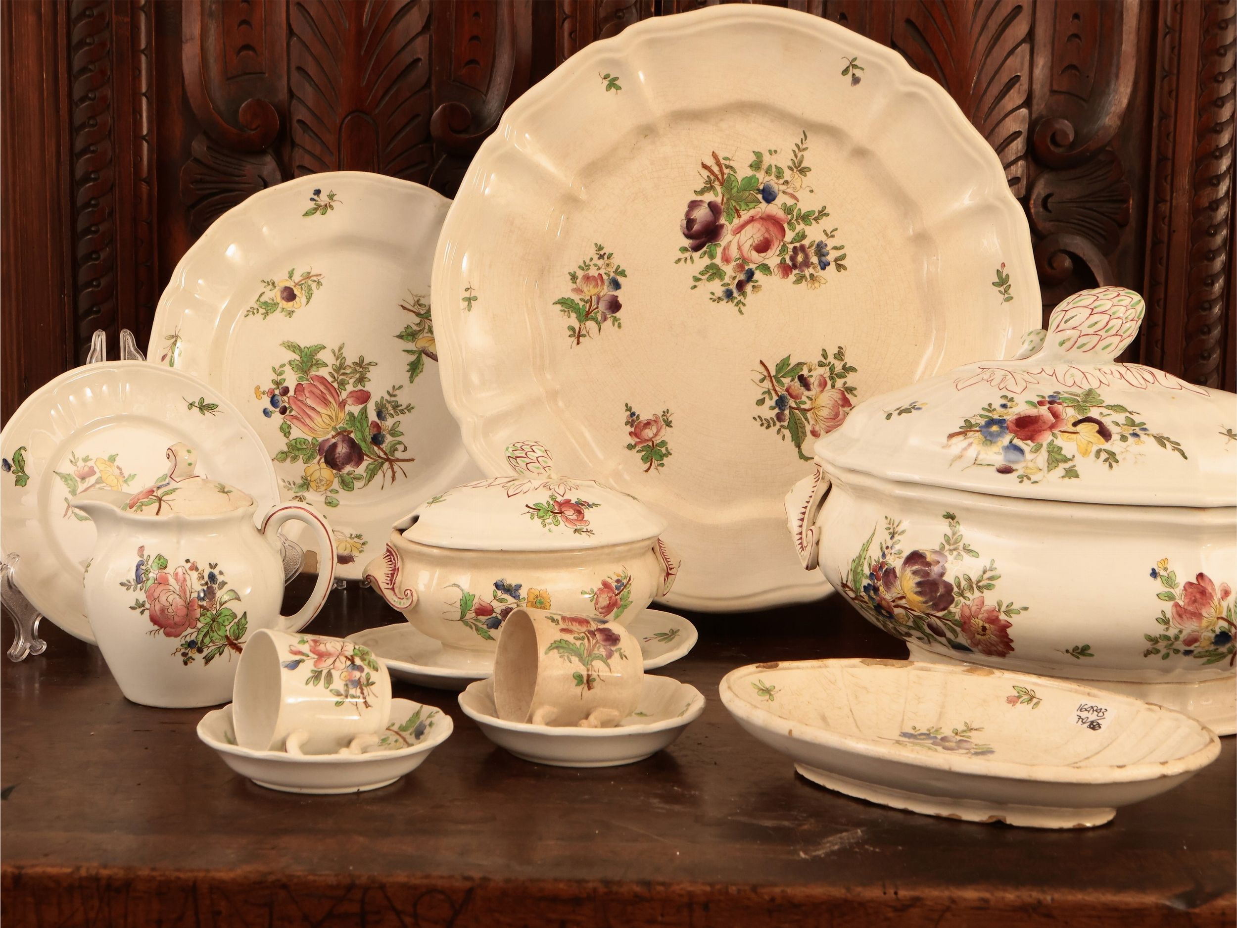 seconda metà del XIX secolo dipinto con motivo floreale policromo, composto da 17 piatti piani, 9 piatti fondi, 12 piattini da antipasto, 6 lunette da insalata, 6 piattini da pane, 9 vassoi ovali a scalare ed uno rotondo, due legumiere, due alzatine, una zuppiera, una fruttiera, 4 tazzine da caffè con piattino, una lattiera ed una zuccheriera (le lunette da insalata, i piattini da pane, i piattini da antipasto, un vassoio ovale, la lattiera, la zuccheriera con marchio diverso), alcuni difetti
