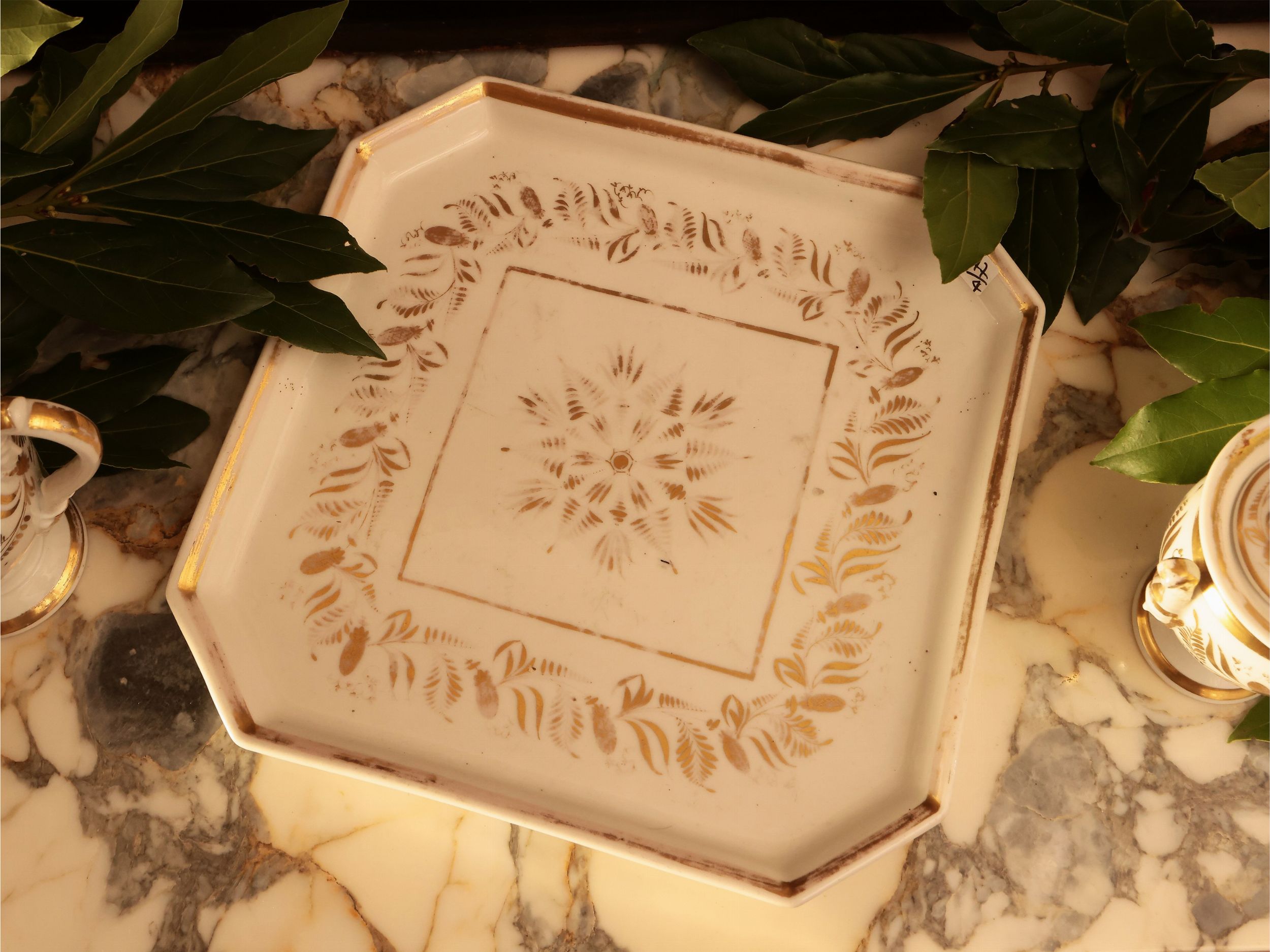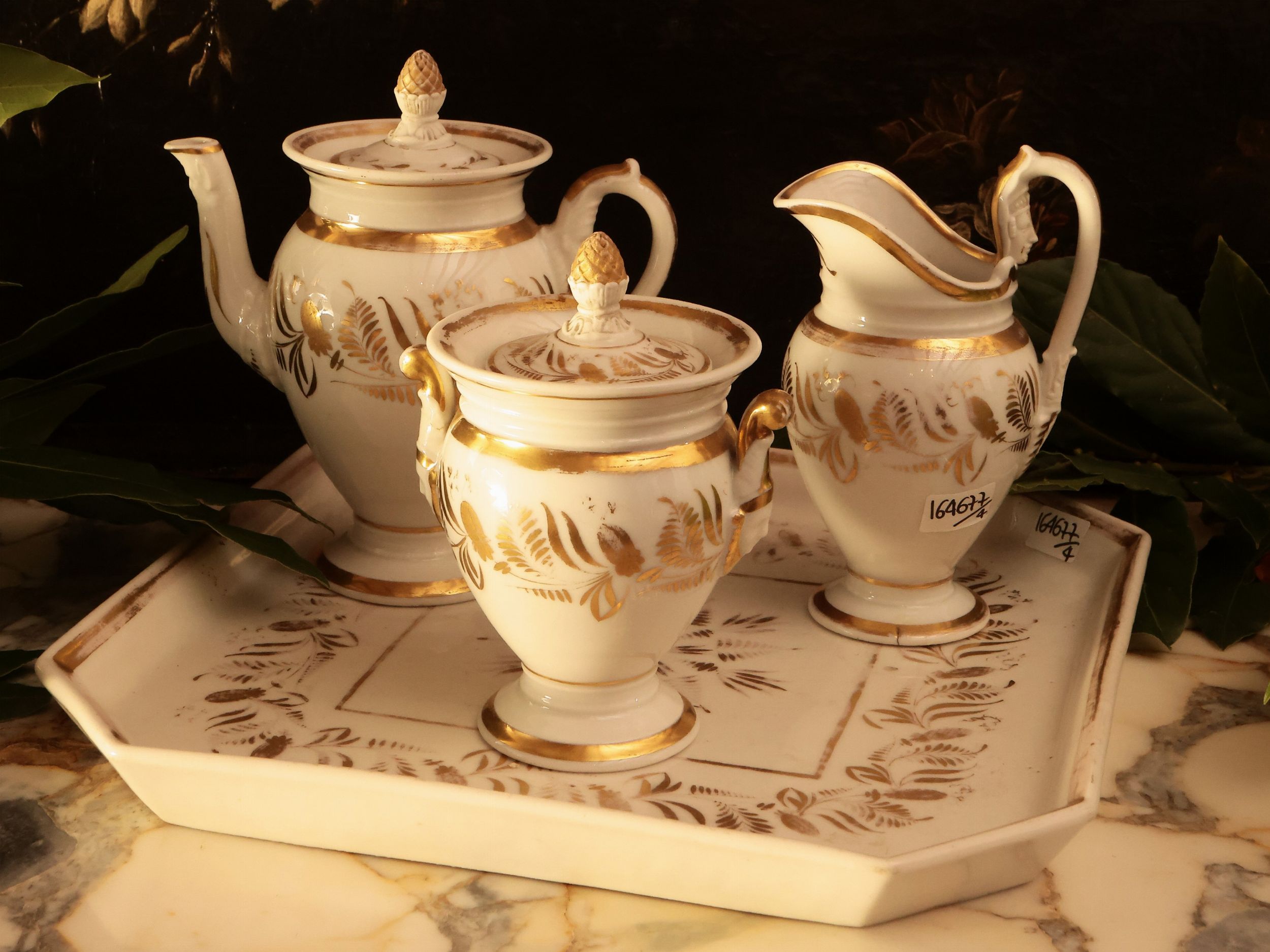 Francia, inizio del XIX secolo composto da teiera, lattiera, zuccheriera e vassoietto, interamente lumeggiati in oro con volute, lievi difetti