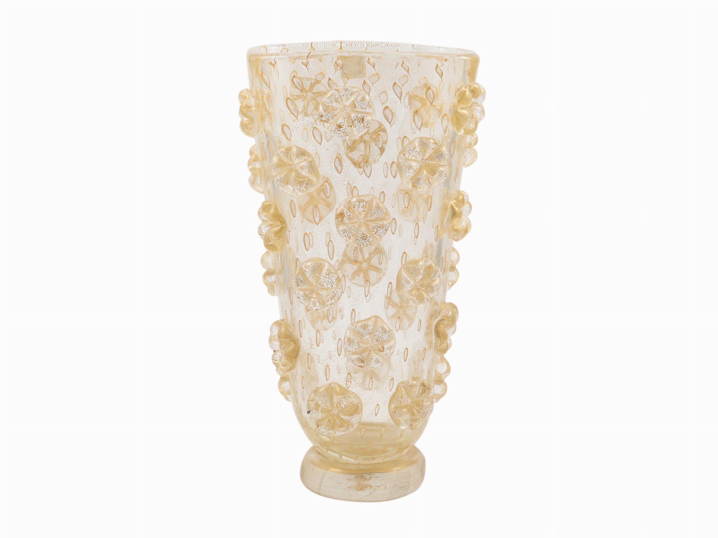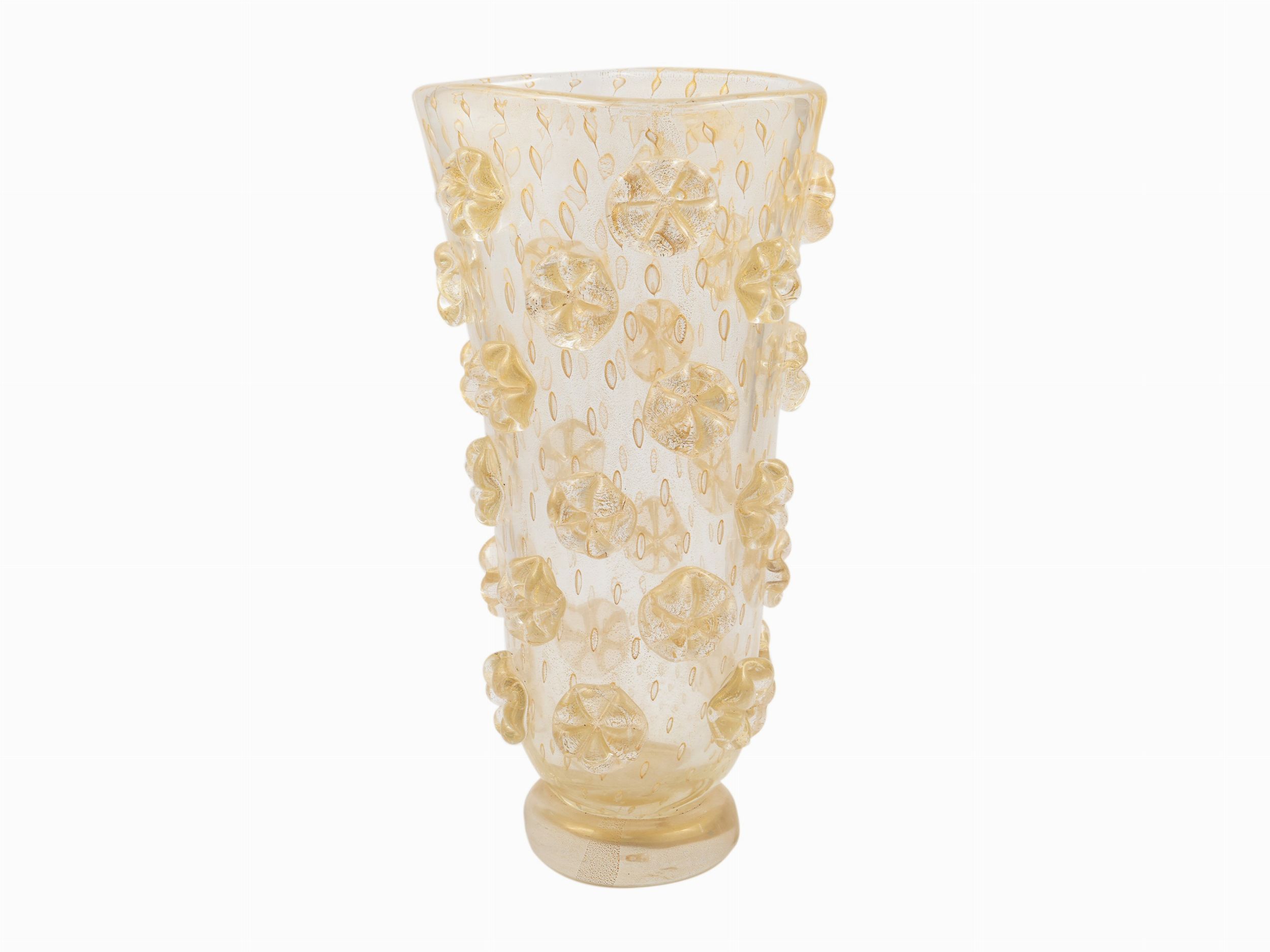 Murano, Italia 1950 circa in cristallo spesso e oro con bolle diffuse ed applicazioni a fiori esagonali sul corpo, base applicata a caldo.