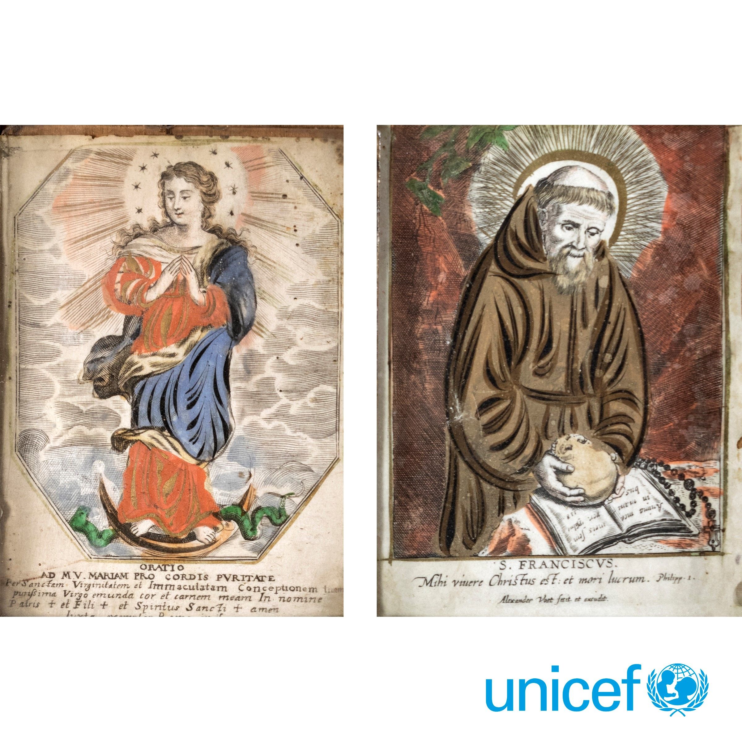 Paesi Bassi, XVII Sec. 'Immacolata Concezione - San Francesco', coppia di incisioni su pergamena, entro cornice