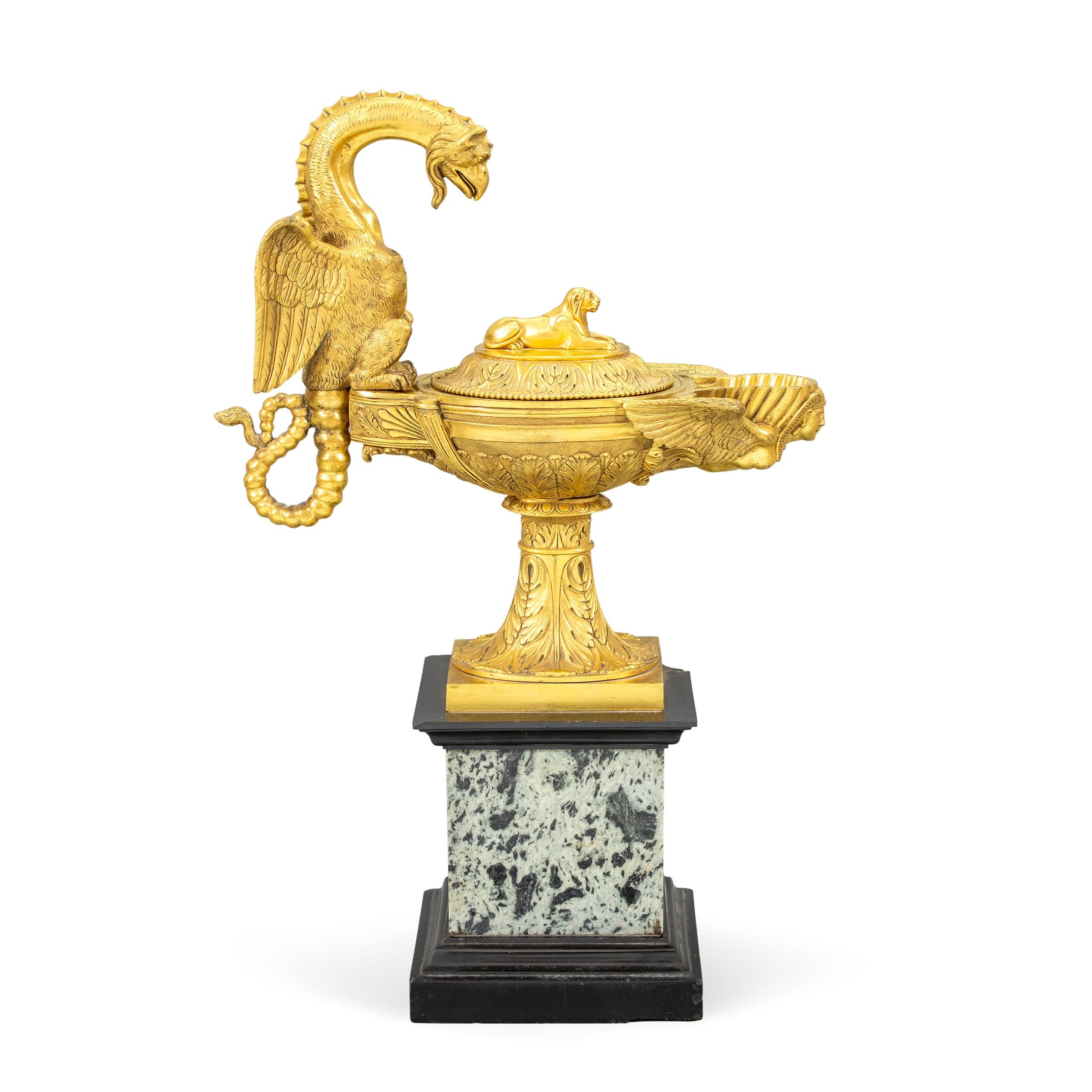 47x31x12 cm. Roma 1820 - 1880 circa vasca cesellata e decorata con foglie di alloro e palmette, manico a foggia di dragone mitologico, coperchio con presa a foggia di leone, poggiante su base a plinto in marmo verde antico e marmo nero, firmata, difetti