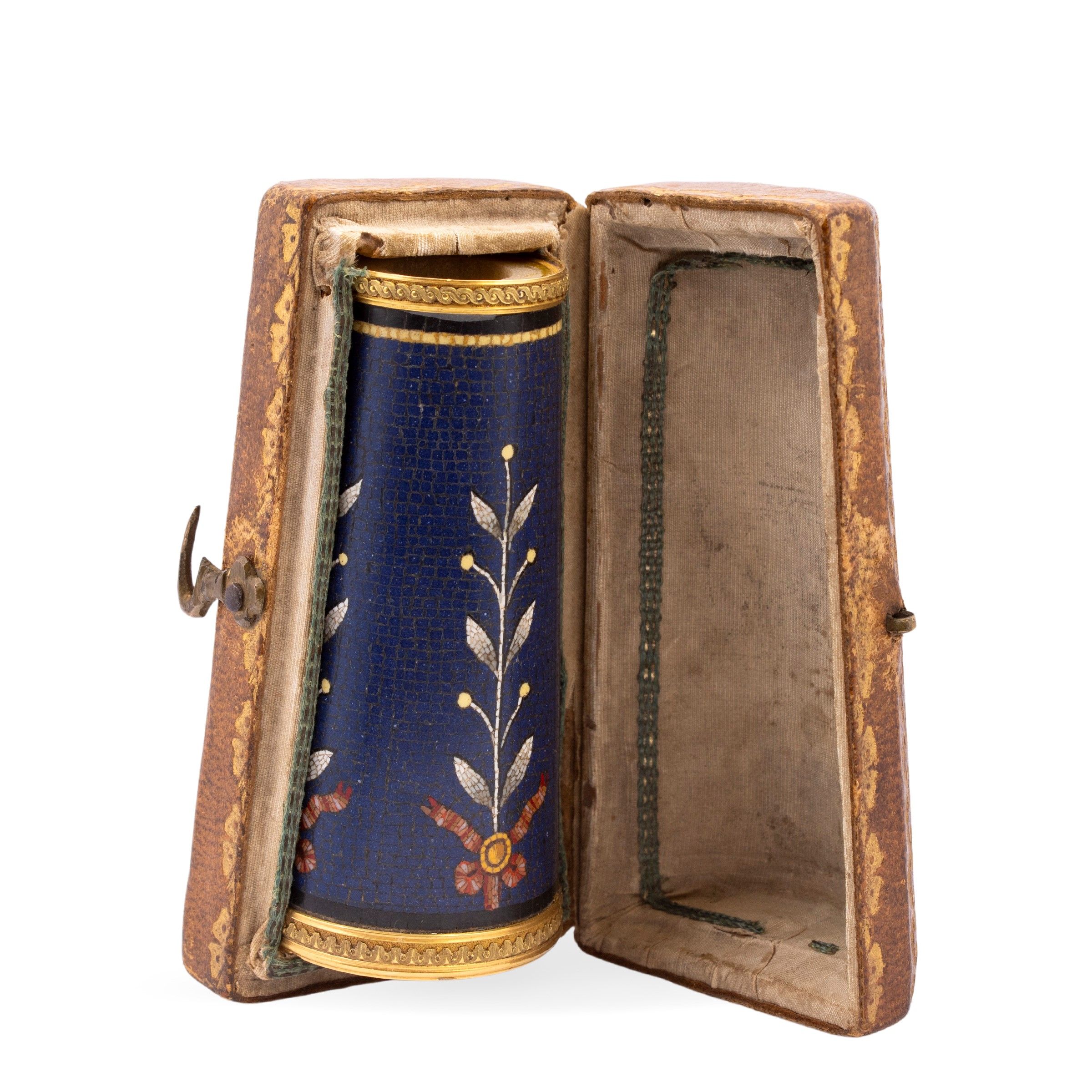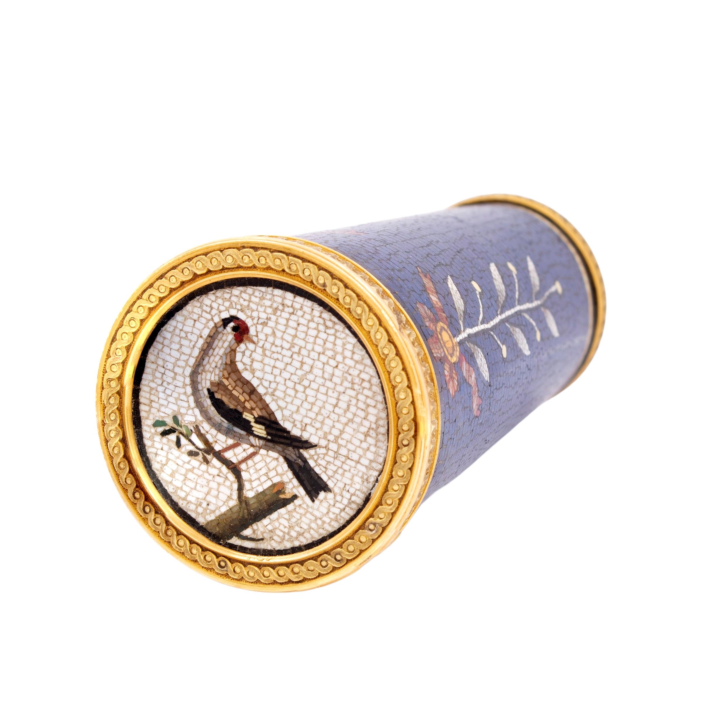 8x3,8 cm. Roma, fine XVIII Sec. corpo cilindrico, decorato con motivi naturalistici e da una placca circolare profilata in oro giallo e raffigurante un cardellino su un ramo, entro custodia Bibliografia di riferimento: A.M. Massinelli, Giacomo Raffaelli, maestro di stile e di mosaico, Aska, pag. 227