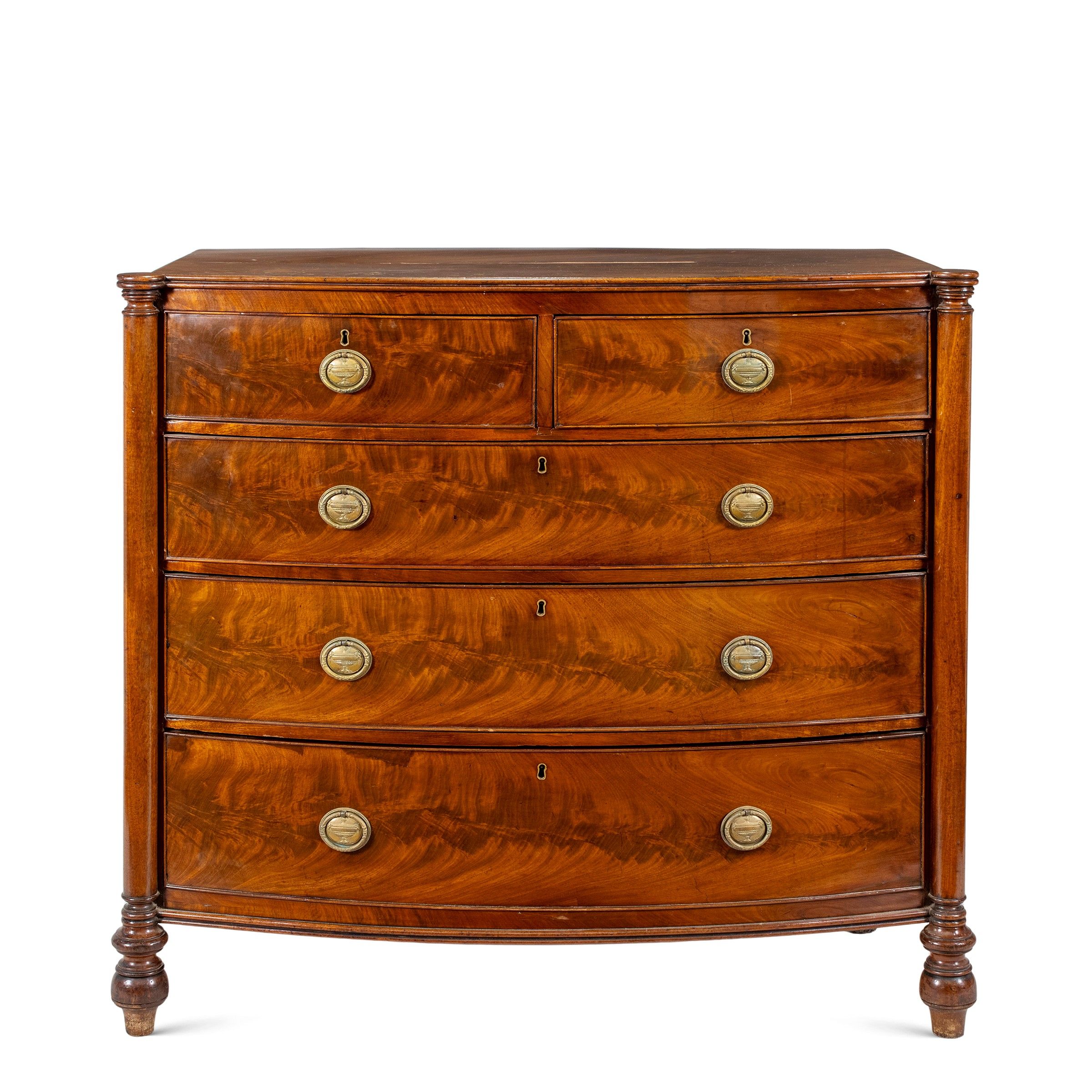 Inghilterra, XIX Sec. piano sagomato, fronte a cinque cassetti delimitati da colonne tornite, maniglie in bronzo, lievi difetti