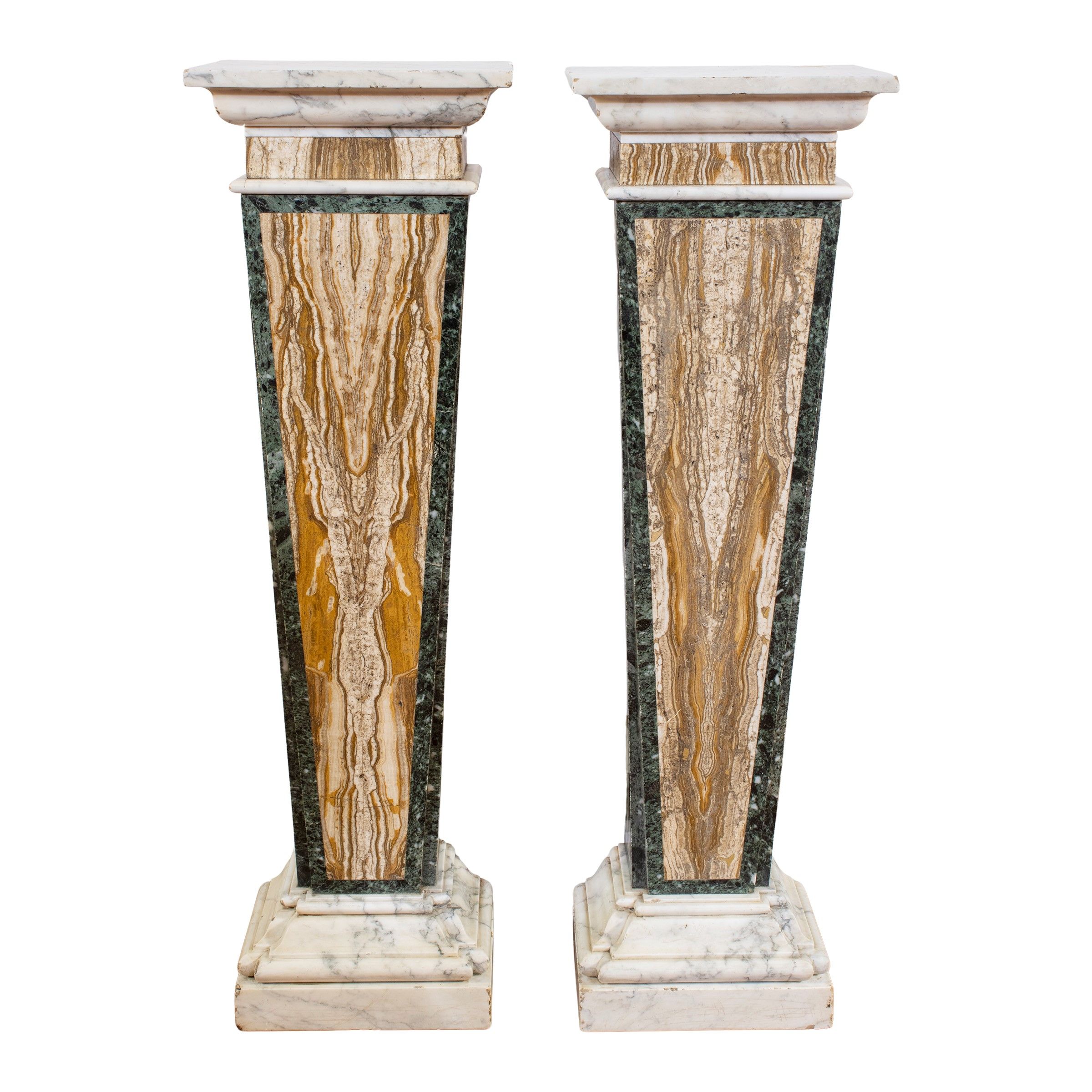 Italia, XIX-XX Sec. a sezione squadrata e rastremata su piede a plinto, lastronate in alabastro listato, verde antico e e breccia di Seravezza, piani e basi in bianco di Carrara, lievi difetti