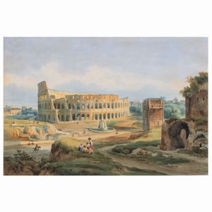 24x34 cm. La Sarraz 1809-Roma 1877 'Veduta del Colosseo', 1845, acquerello su carta, firmato e datato in basso [..]