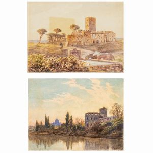 9,5x12,5 cm. Roma 1846 - 1911 'Veduta della campagna romana - Paesaggio dal Tevere', 1873, coppia di acquerelli [..]
