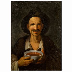 83x62 cm. XVIII Sec. 'Popolano con tazza di brodo', olio su tela, entro cornice