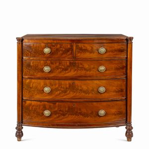 103x110x53 cm. Inghilterra, XIX Sec. piano sagomato, fronte a cinque cassetti delimitati da colonne tornite, maniglie [..]