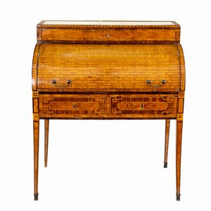 117x98x55 cm. Piemonte, XVIII Sec. lastronato ed intarsiato in legni vari, fronte a cinque cassetti con apertura [..]
