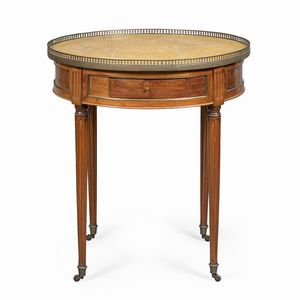 73x65 cm. Francia, XIX Sec. piano circolare in marmo giallo delimitato da ringhierina in bronzo traforato, fascia [..]