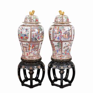 vaso 80x40 cm. Cina, XIX-XX Sec. decoro Famiglia Rosa con figure e paesaggi entro riserve, prese dei coperchi [..]