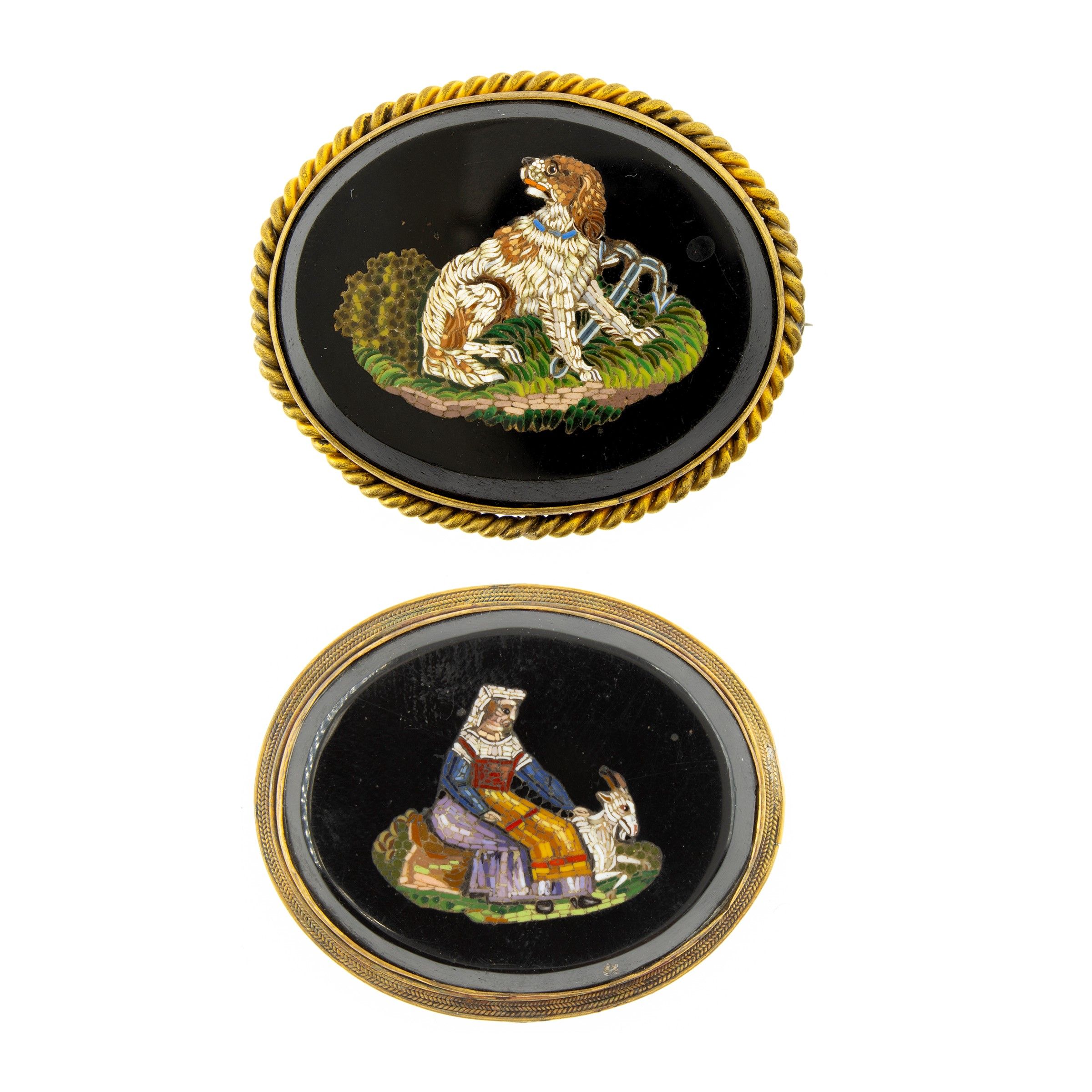 Due placche in micromosaico montate a spilla