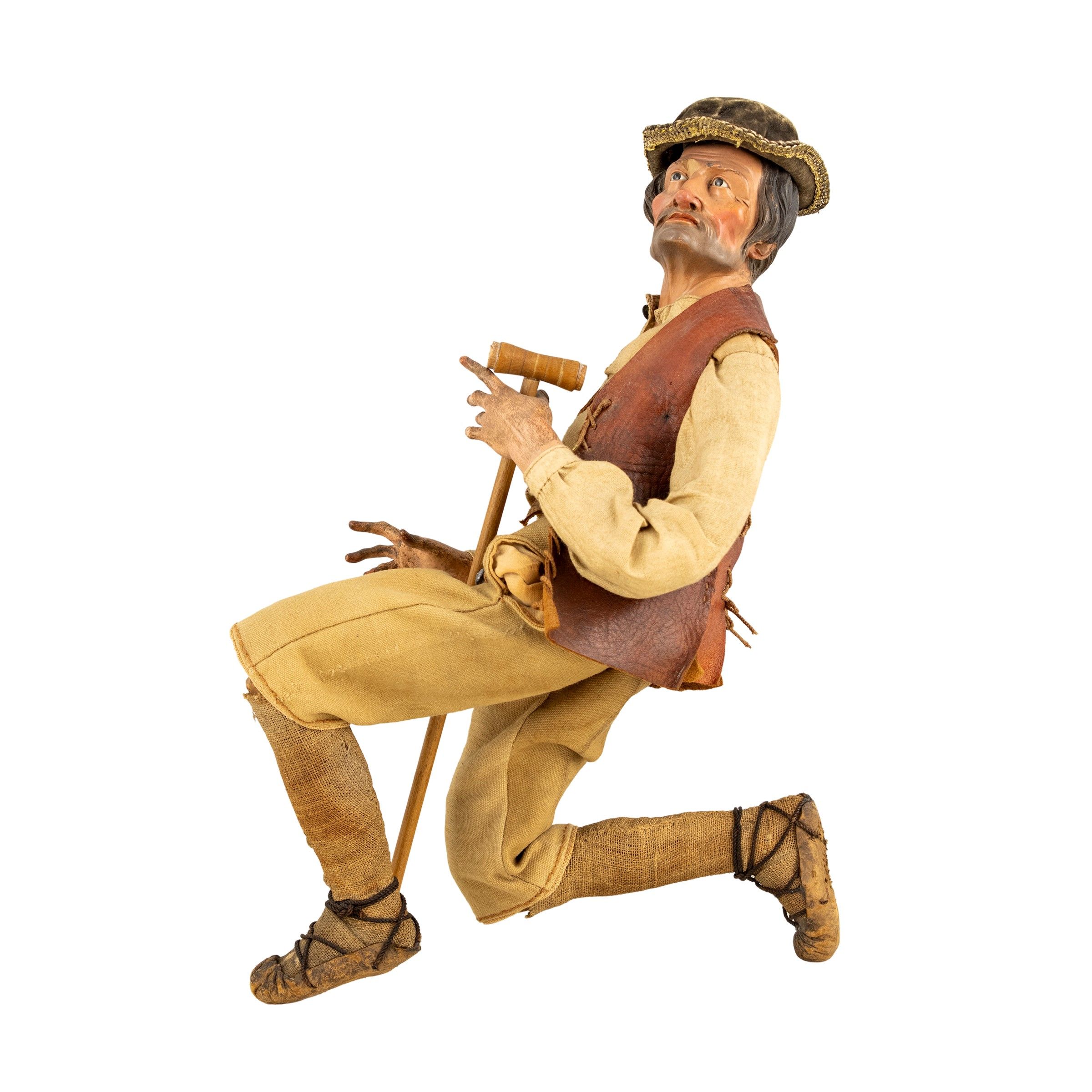 Napoli, XVIII-XIX Sec. 'Pastore', scultura da presepe in terracotta policroma, legno e tessuto, lievi difetti