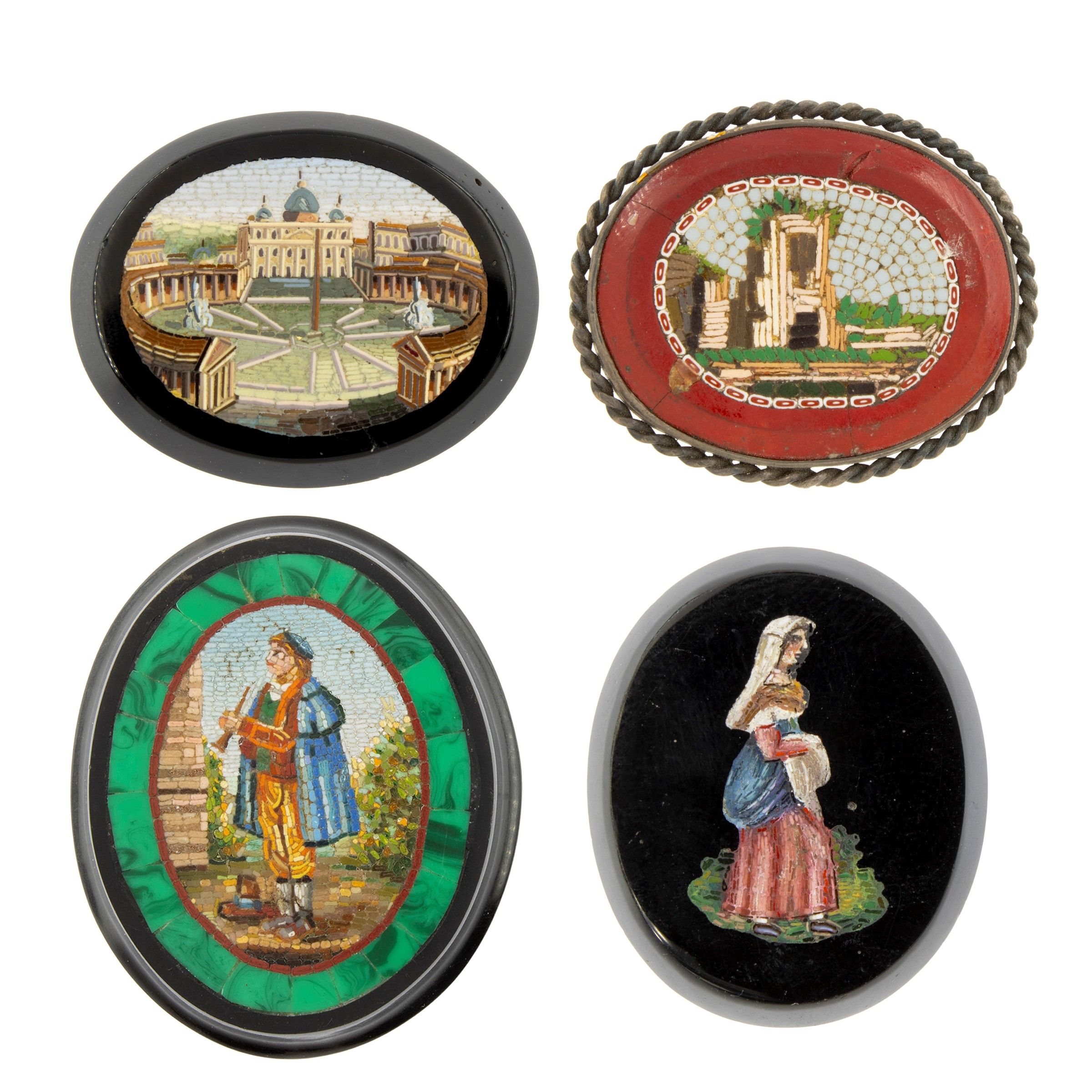 Roma, XIX Sec. composto da: -una placca in micromosaico su nero del Belgio raffigurante Piazza San Pietro, 3,7x3,2 cm. -una spilla in micromosaico su rosso antico raffigurante rovine, 3,5x3 cm. -una placca in micromosaico su nero del Belgio raffigurante un suonatore entro riserva in malachite, 5,5x4,5 cm. -una placca in micromosaico su nero del Belgio raffigurante una giovane popolana 3x2.6 cm.