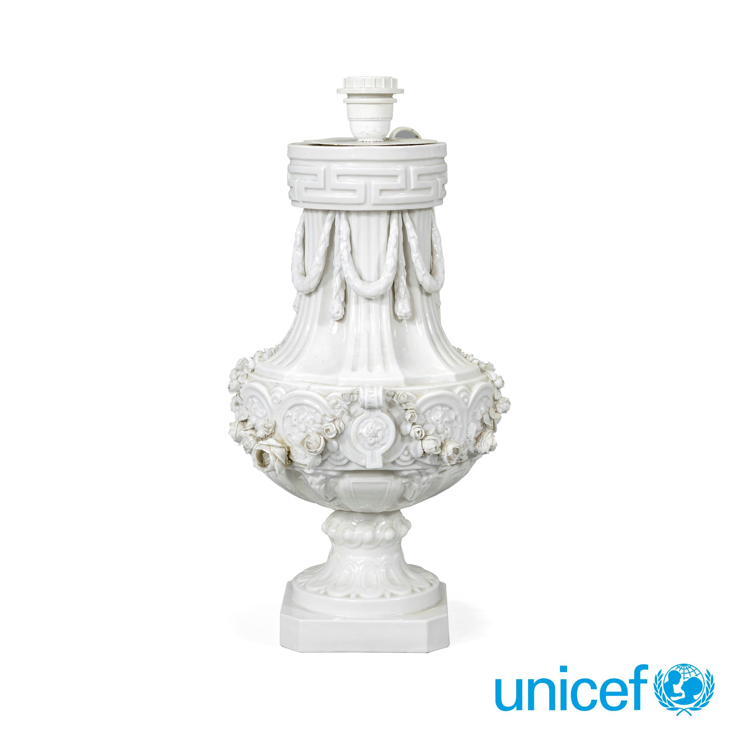 XX Sec. lampada da tavolo in porcellana bianca, decorata con motivi vegetali e floreali, marchio sotto la base, restauri e mancanze