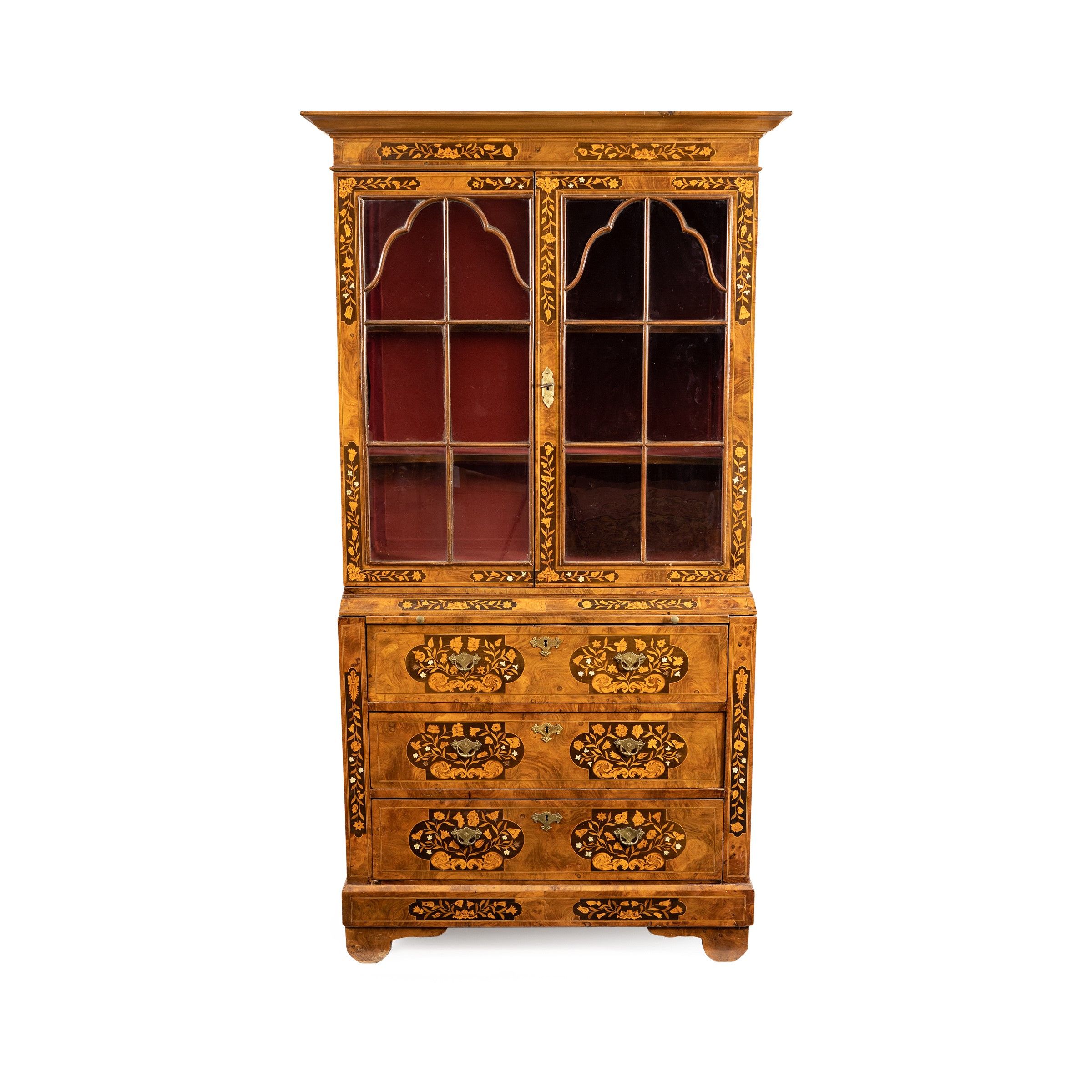 Olanda, XIX Sec. intarsiato con motivi naturalistici in legni di frutto vari, parte superiore a due ante a vetro, parte inferiore con tablette estraibile e tre cassetti sottostanti, maniglie in bronzo, piedi a mensola, lievi difetti