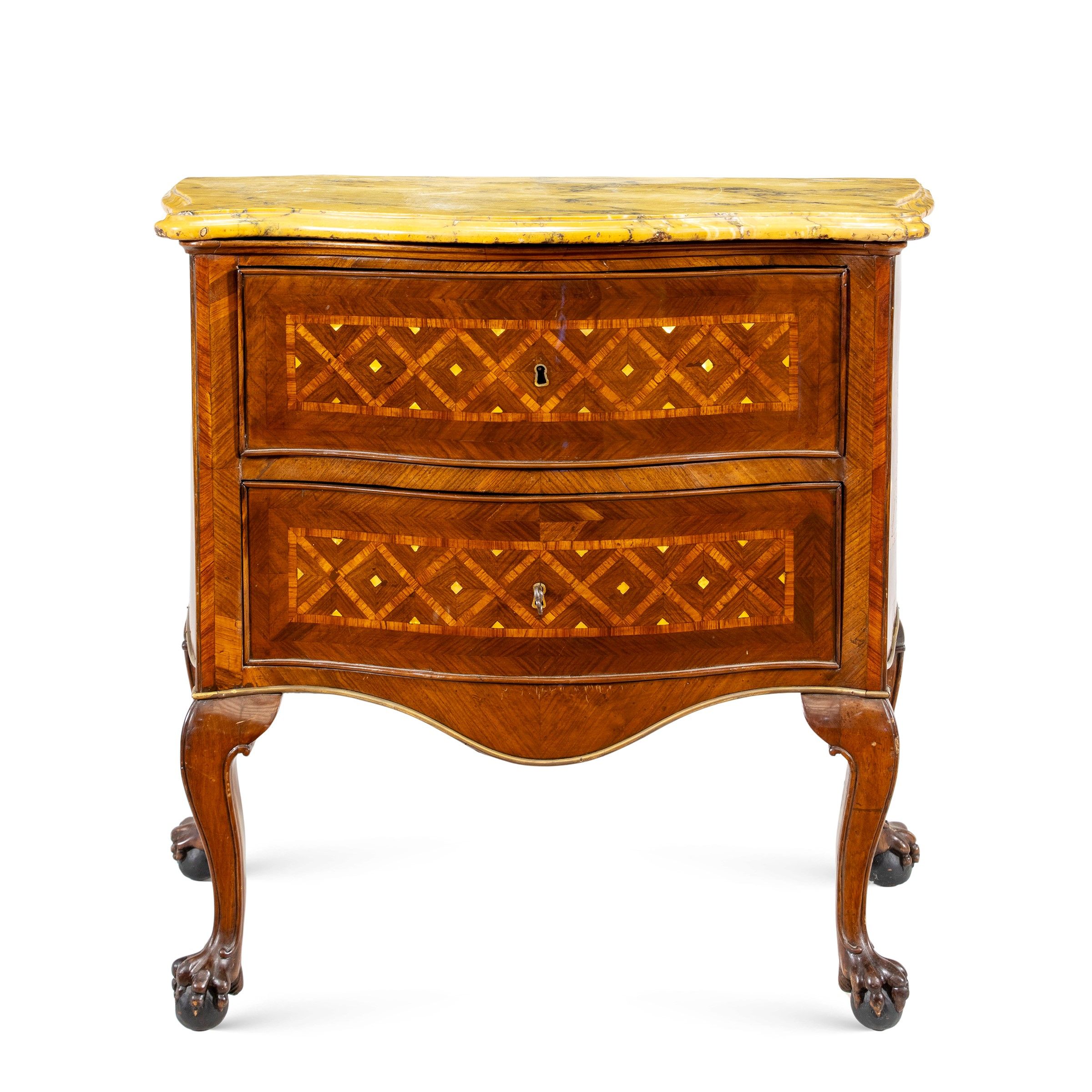 Roma, XVIII Sec. fronte e fianchi mossi intarsiati in madreperla con motivi geometrici, piano sagomato in marmo giallo Siena con due cassetti sottostanti, gambe mosse con terminale a zampa di leone su sfera, lievi difetti
