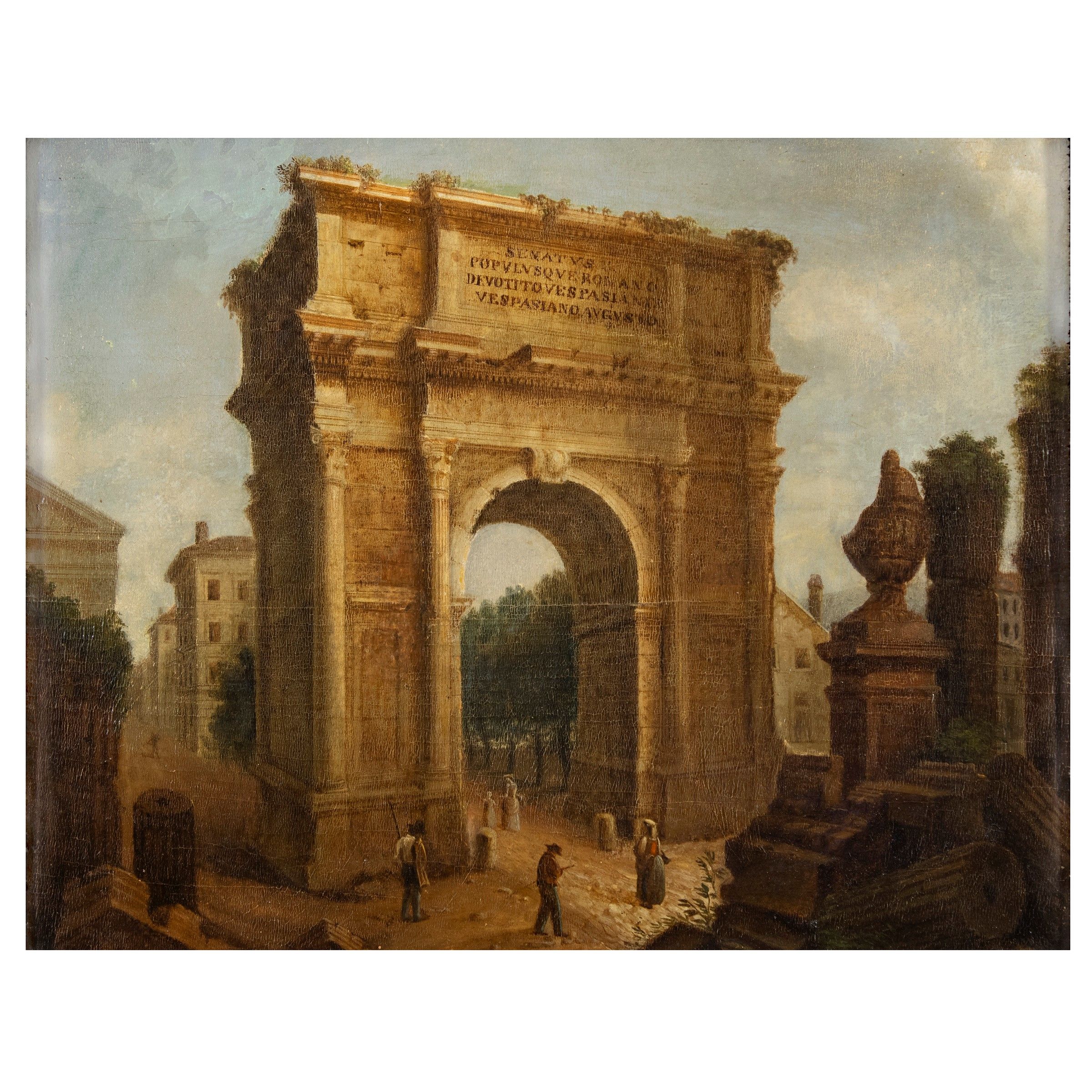 XVIII Sec. 'Arco di Tito con rovine e personaggi', olio su tavola, entro cornice