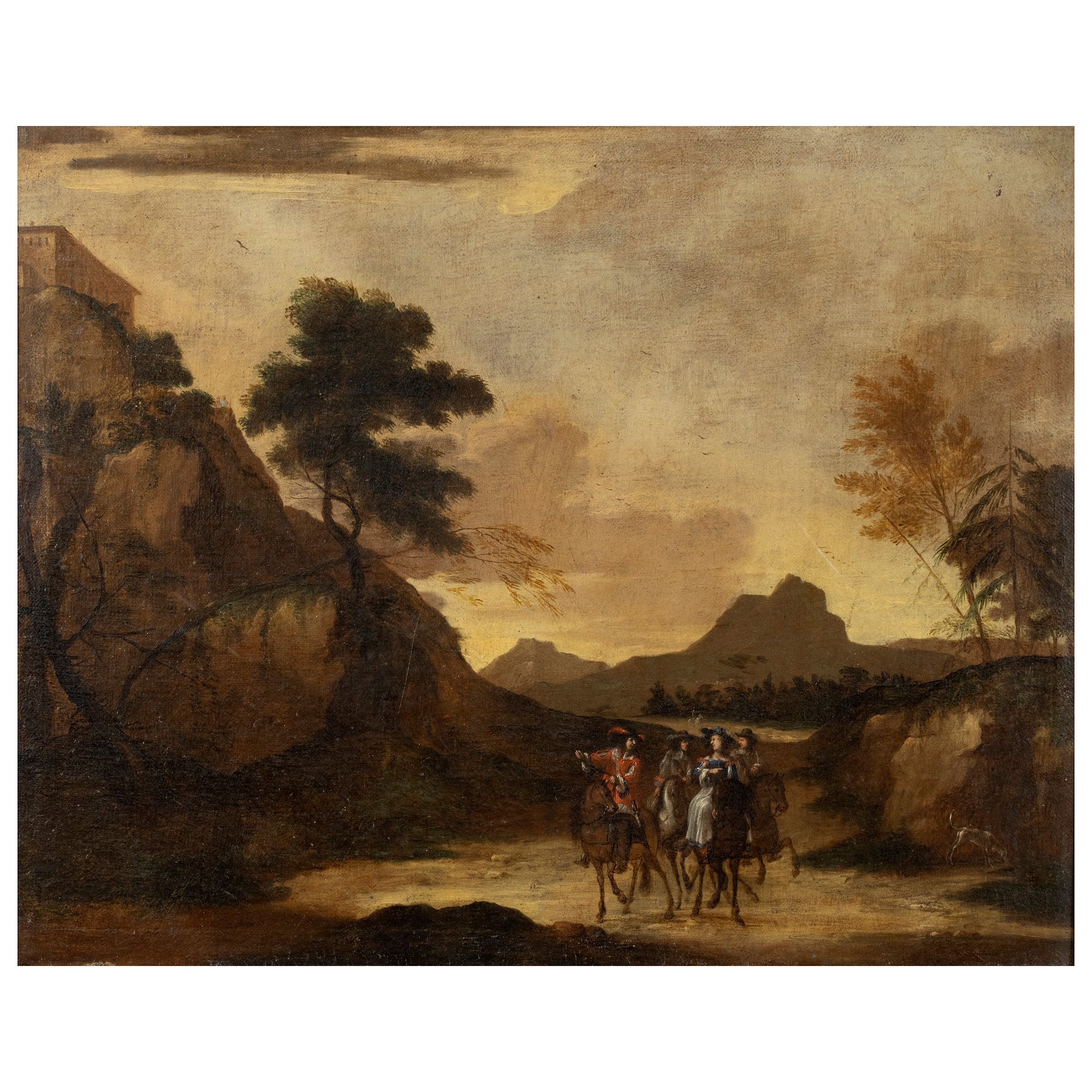 XVII-XVIII Sec. 'Paesaggio con cavalieri', olio su tela, entro cornice