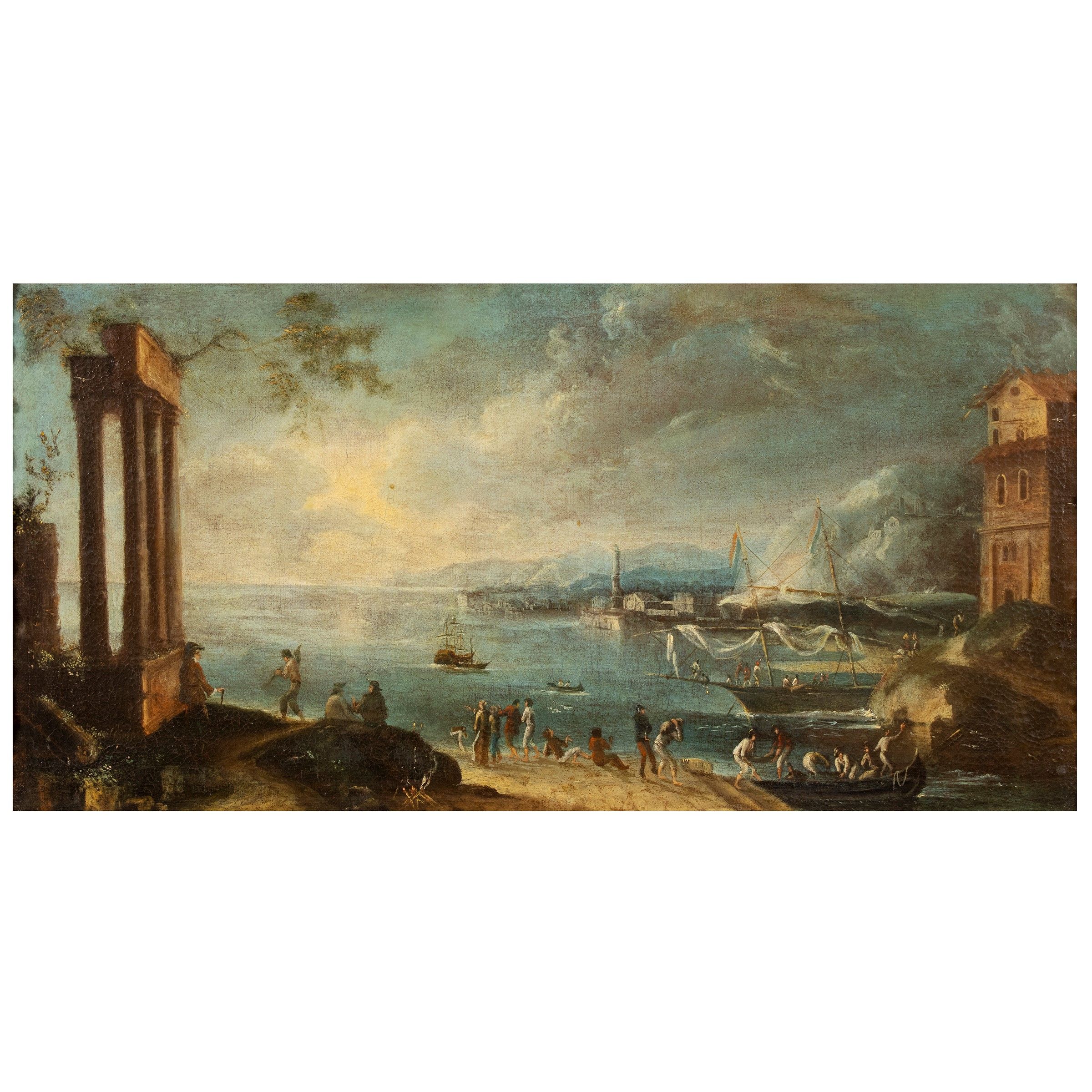 XVIII Sec. 'Marina con pescatori', olio su tela, entro cornice