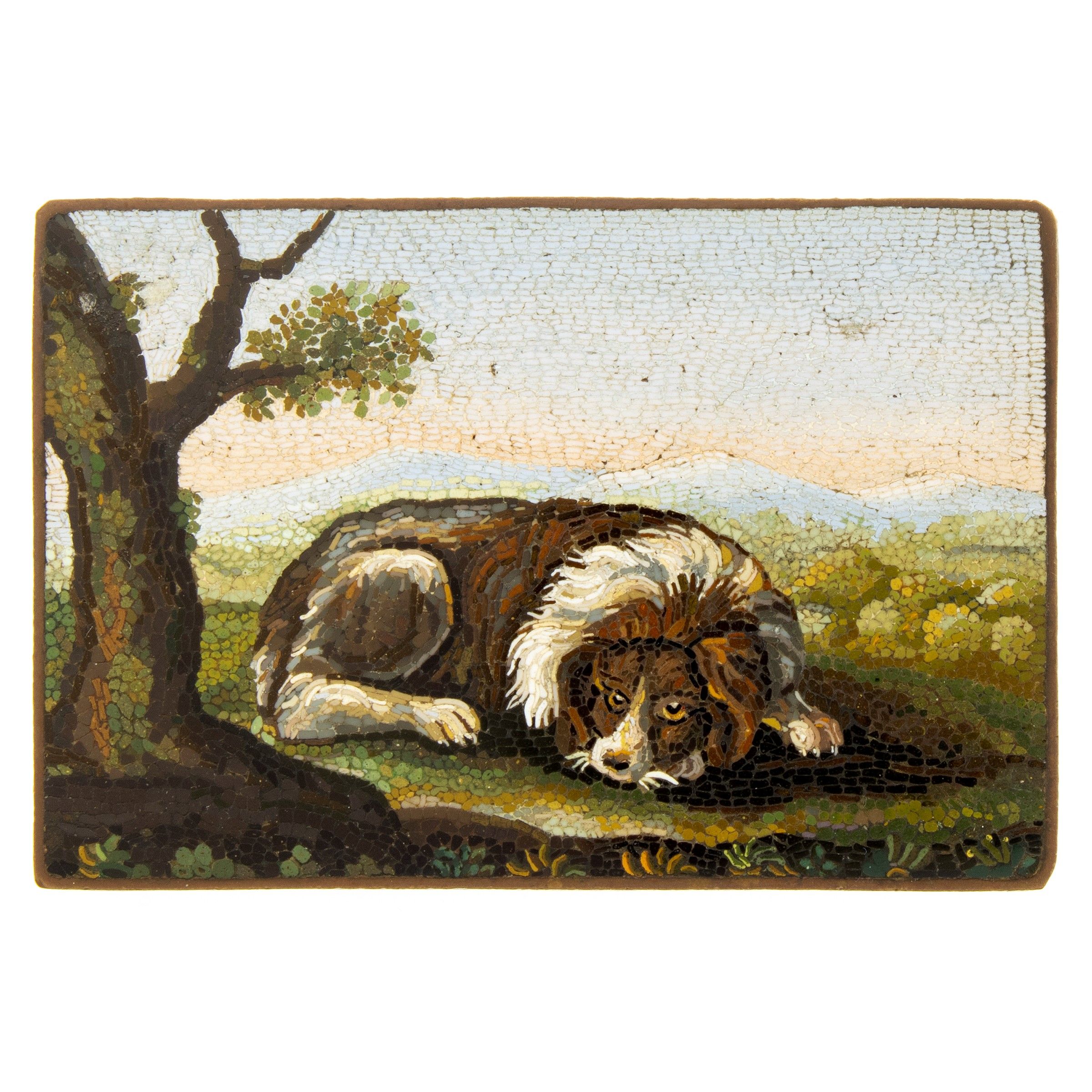 Roma, XIX Sec. raffigurante un cane accovacciato con sfondo di paesaggio su cassina in rame
