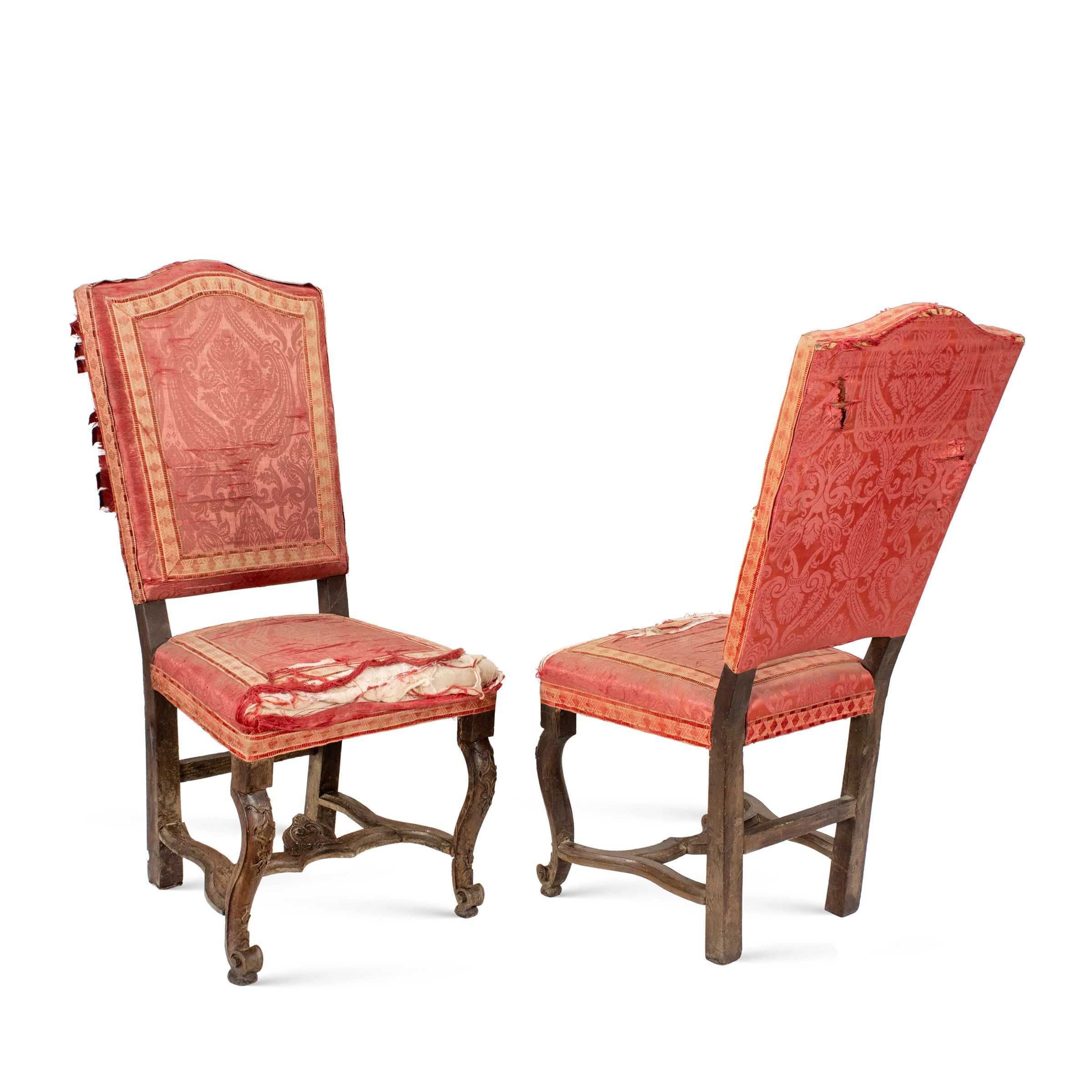 Lombardia, XVI - XVIII Sec. gambe sagomate intagliate con motivi vegetali, riunite al centro da crociera, sedute e schienali imbottiti e rivestiti in tessuto, difetti
