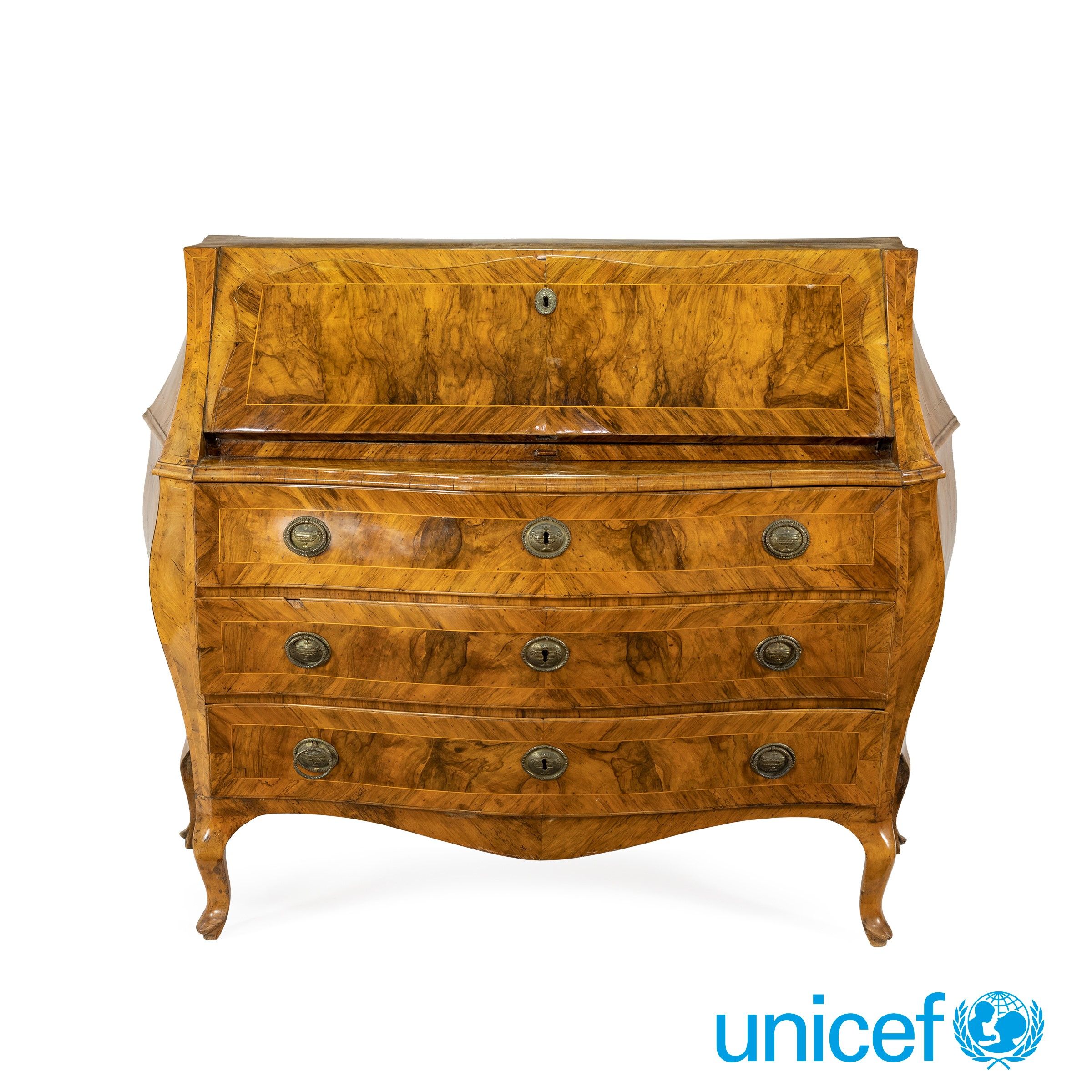 XVIII-XIX Sec. fronte mosso con ribalta celante tiretti vari, tre cassetti sottostanti con maniglie in bronzo, gambe con terminale a ricciolo, difetti e piccole mancanze
