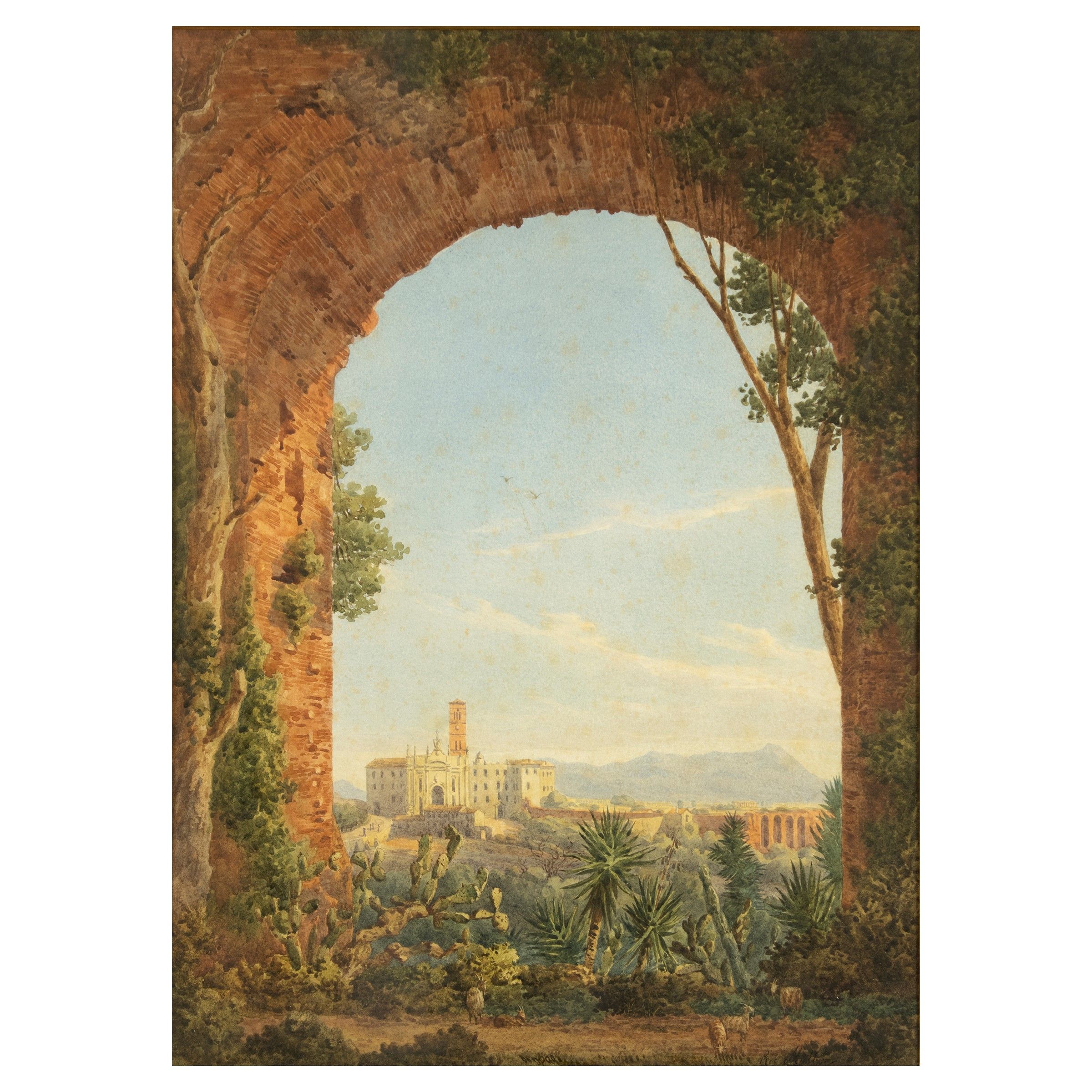 Basilea 1802 – Roma 1885 'Santa Croce in Gerusalemme -Roma', acquerello su carta, firmato in basso a destra, entro cornice