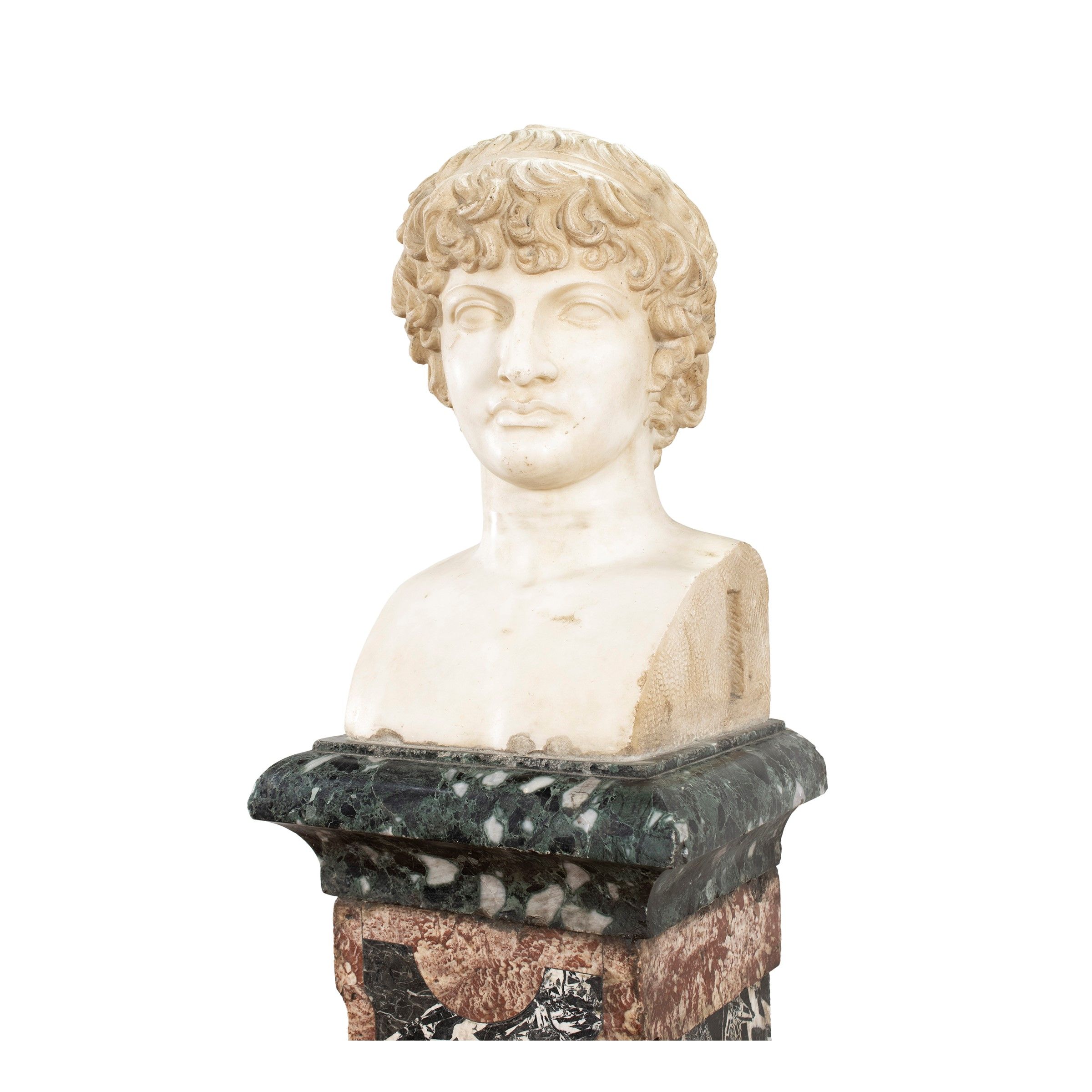Italia, XVIII - XIX Sec. raffigurante busto di Antinoo poggiante su erma in breccia verde, bianco e nero d' Aquitania e alabastro fiorito