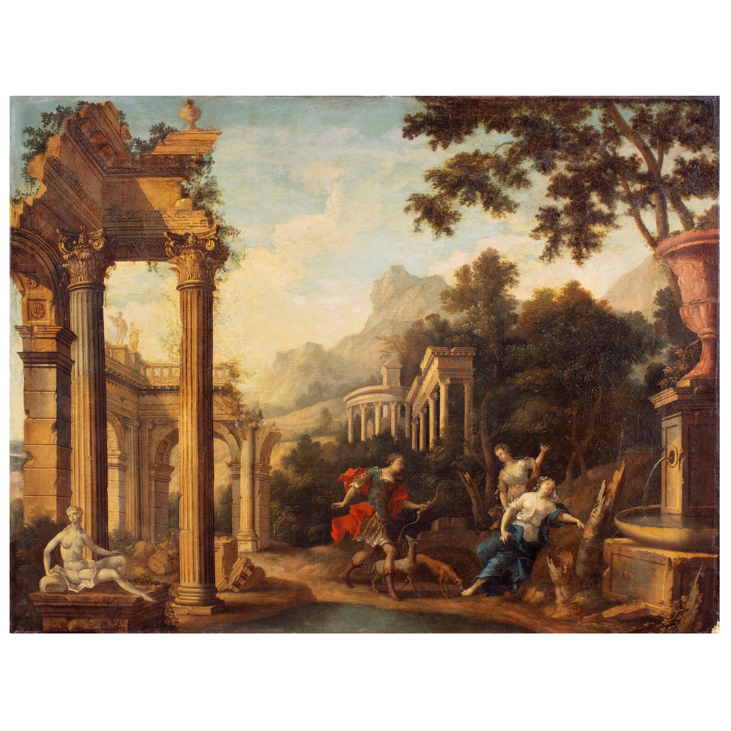 XVIII Sec. 'Scena mitologica con figure e rovine', olio su tela