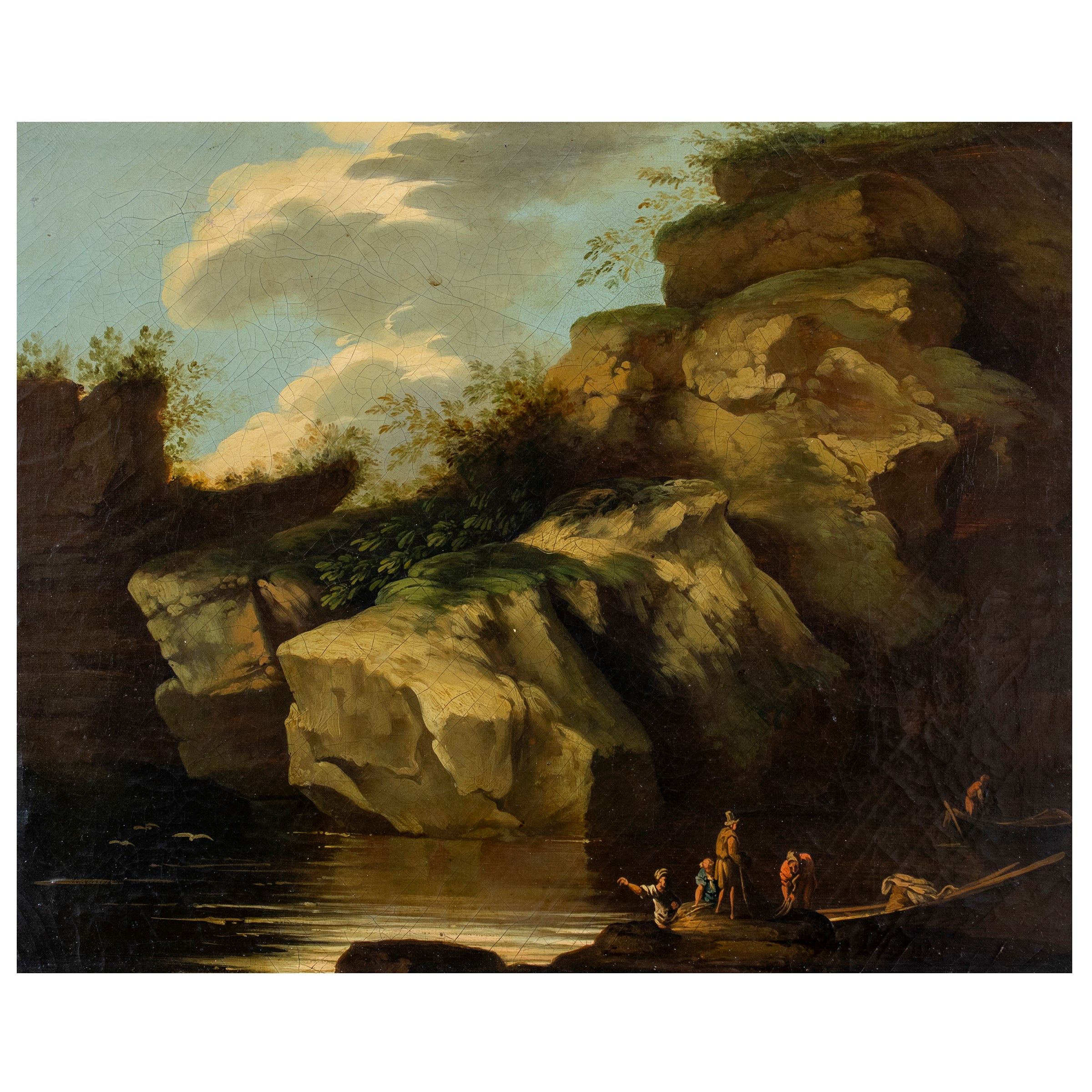 XVIII Sec. 'Paesaggio con pescatori', olio su tela, entro cornice
