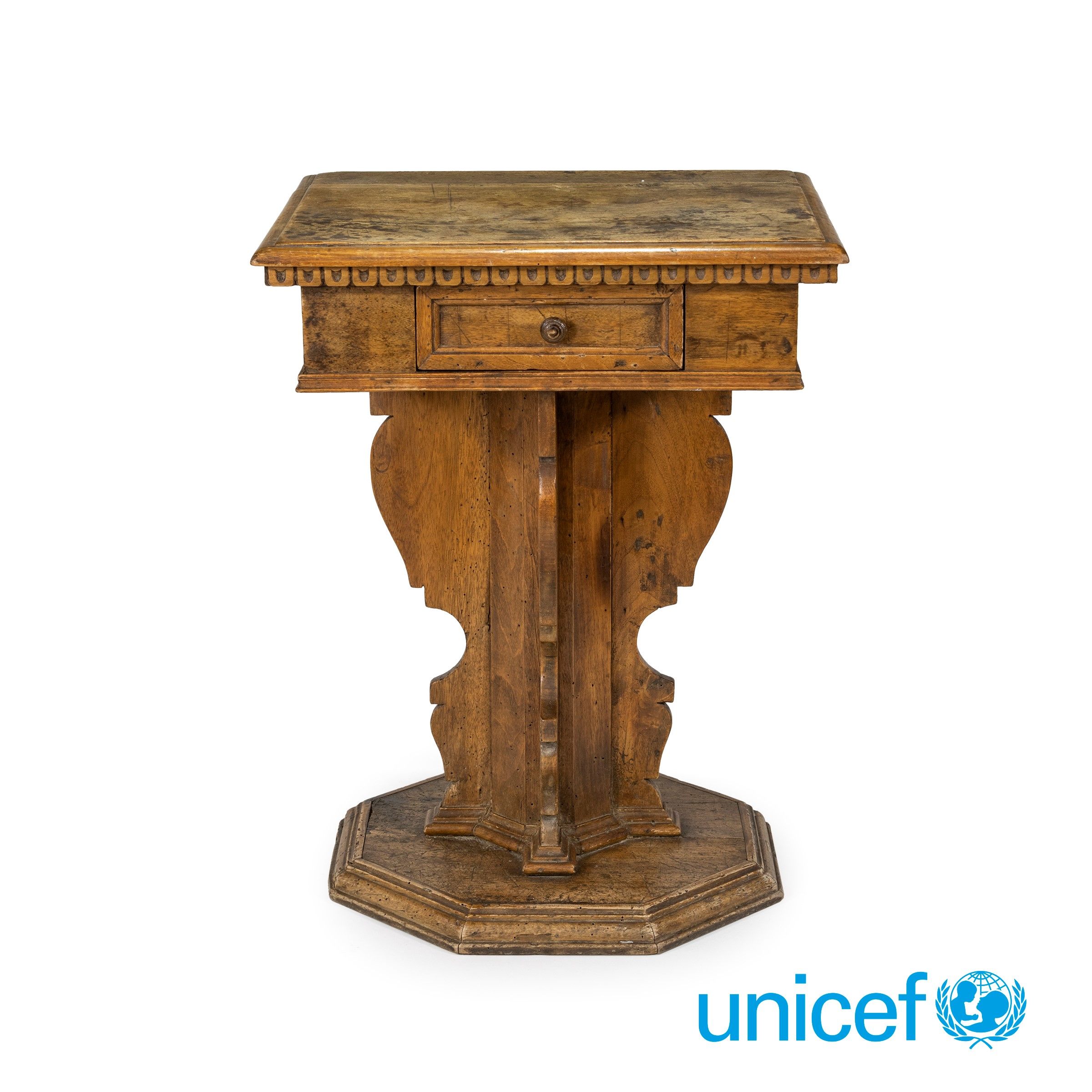 Italia, XVIII-XIX Sec. piano squadrato, fascia con un tiretto sottostante, poggiante su sostegno architettonico, base esagonale, difetti