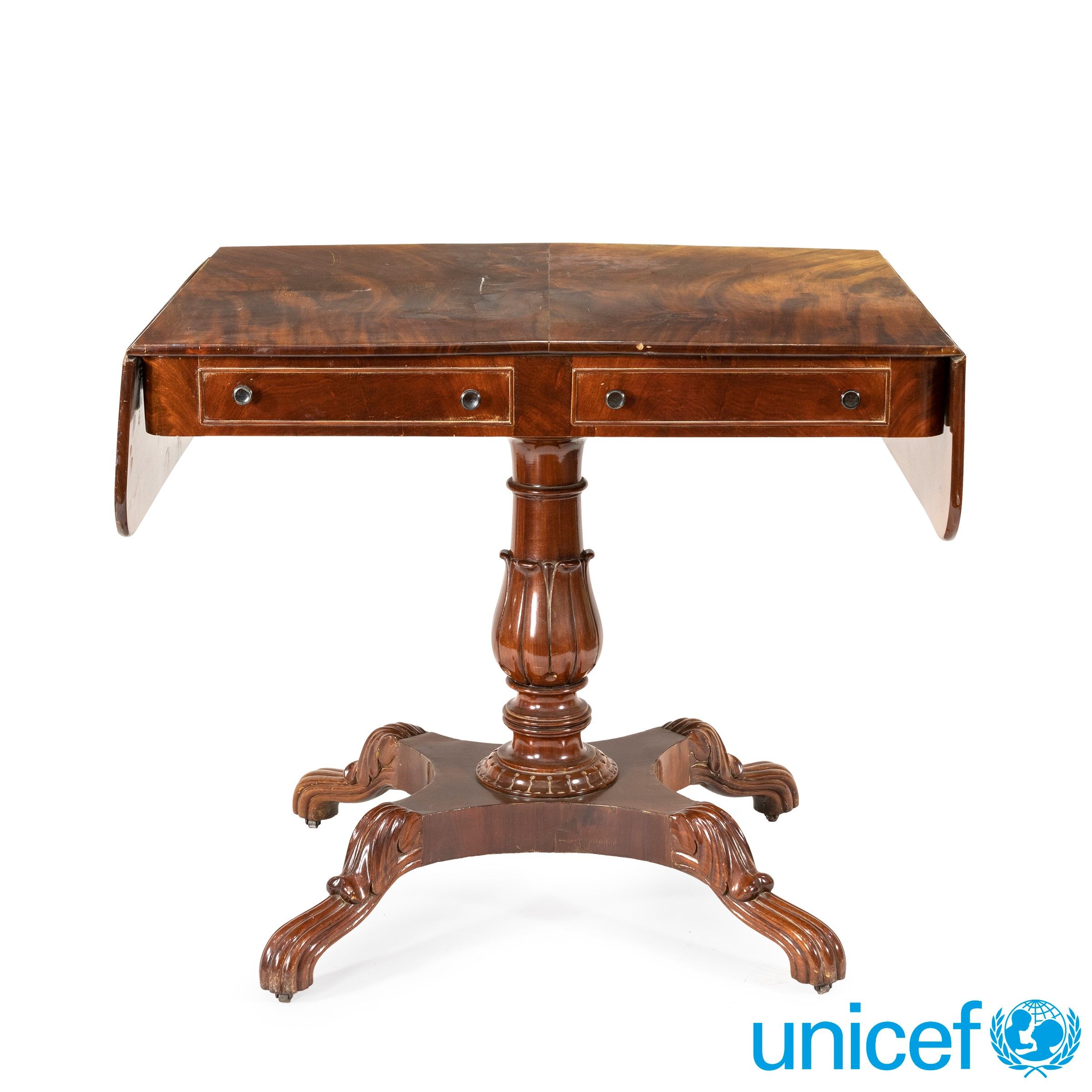 Inghilterra, XIX Sec. piano rettangolare con fascia sottostante a due cassetti, poggiante su sostegno tornito e base sagomata a quattro piedini, difetti