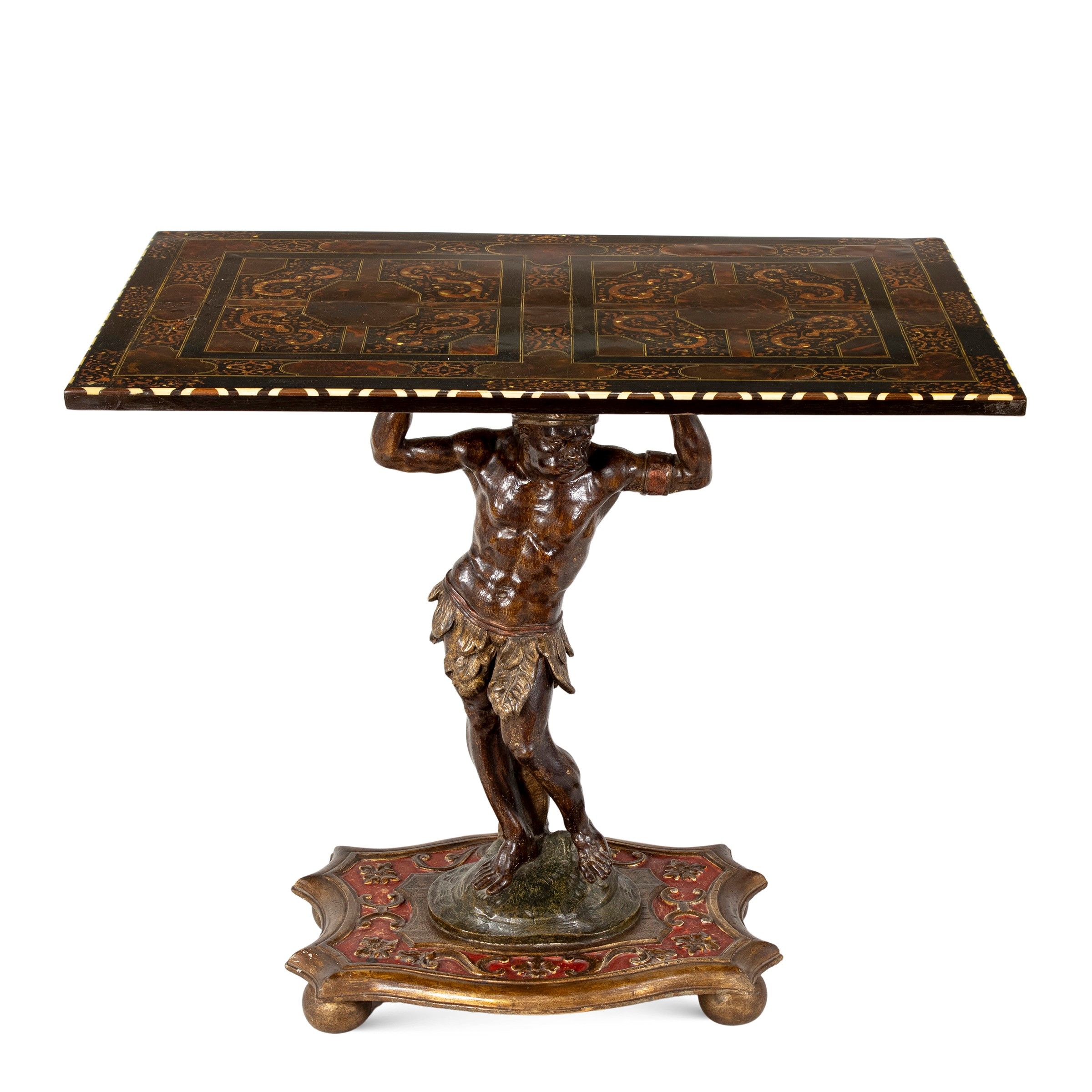 Italia, XVIII - XIX Sec. piano rettangolare intarsiato in tartaruga e madreperla con motivi geometrici, poggiante su sostegno a foggia di moro veneziano, base sagomata in legno laccato e dorato, piedini a cipolla