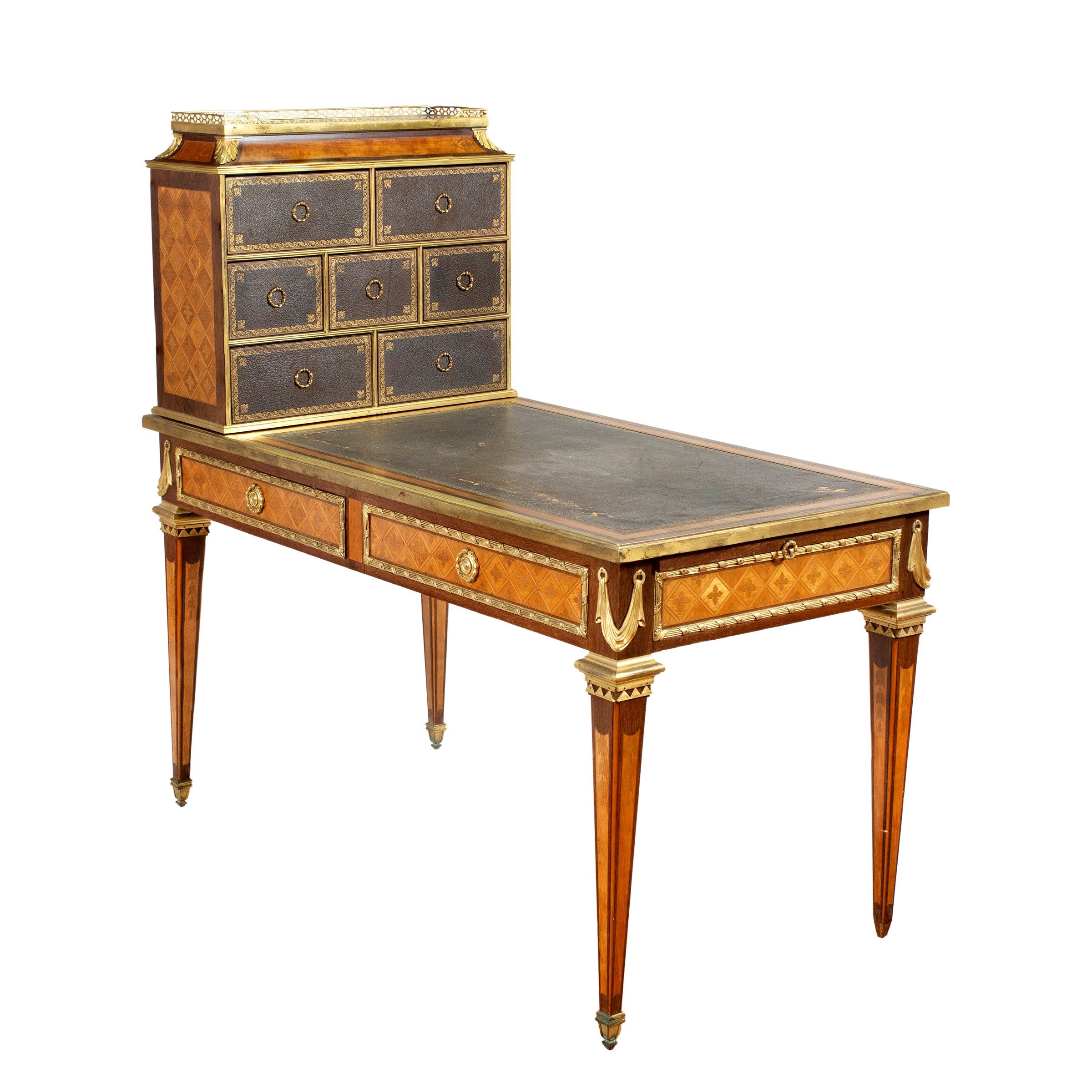 130x133x66 cm. Francia, XIX Sec. lastronato in legni vari ed intarsiato con motivi vegetali e geometrici, piano rettangolare parzialmente rivestito in pelle con due cassetti sottostanti e una tablette estraibile, alzata a sette cassetti con piano in marmo grigio, gambe troncoconiche, piedini in bronzo dorato, un piedino mancante, lievi difetti
